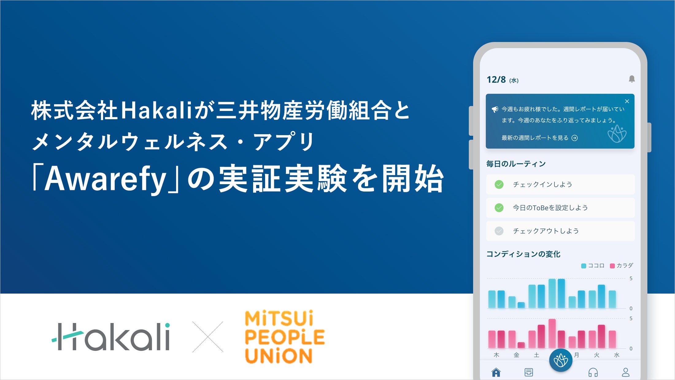 株式会社Hakali(所在地:東京都新宿区、代表取締役社長 小川 晋一郎、以下 Hakali)の提供するメンタルウェルネス・アプリ「Awarefy」は、三井物産労働組合(通称:Mitsui People Union)の協力のもと、「Awarefy」を用いた実証実験を開始します。