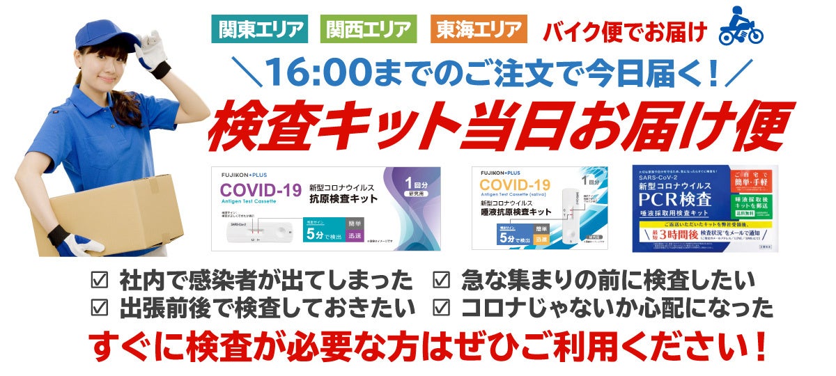 - 緊急時にもすぐに検査ができる!抗原検査キットをバイク便で当日中にお届け