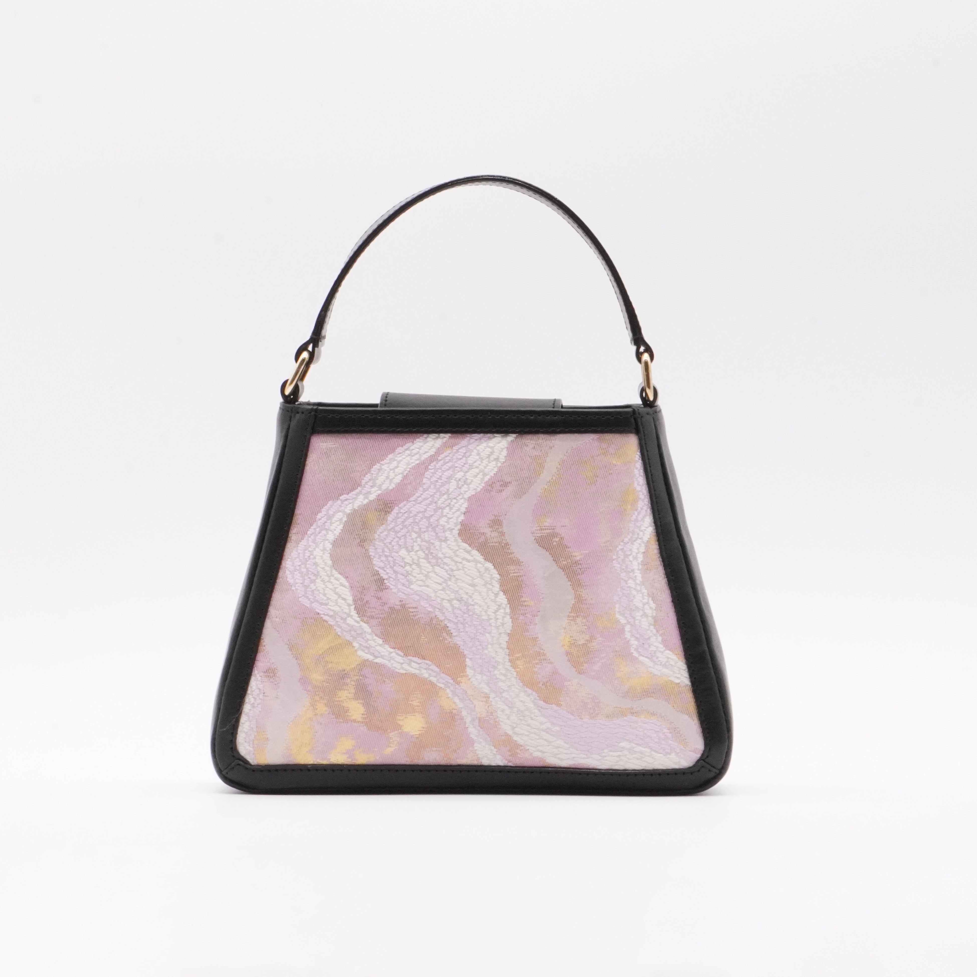 シンプルなデザインながら、開閉部分に帯を大胆かつ豪華にあしらったショルダーバッグ。