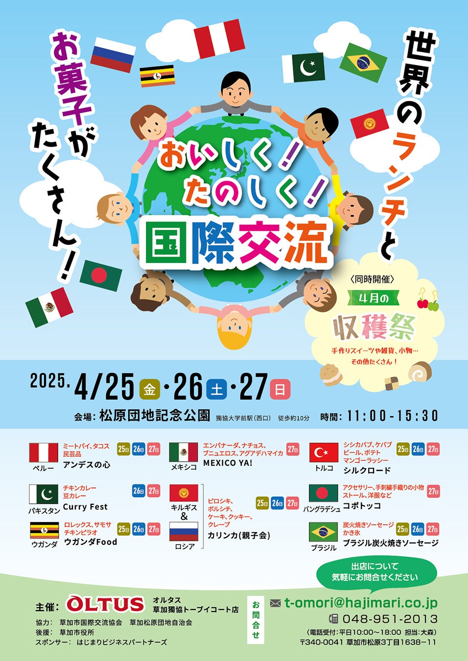 株式会社はじまりビジネスパートナーズでは、2025年4月25日(金)から3日間、埼玉県草加市・松原団地記念公園にて、「みんながつながるマーケット、春の収穫祭」「おいしい!たのしい!国際交流祭り」を開催