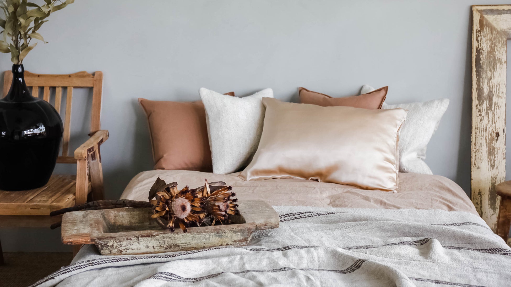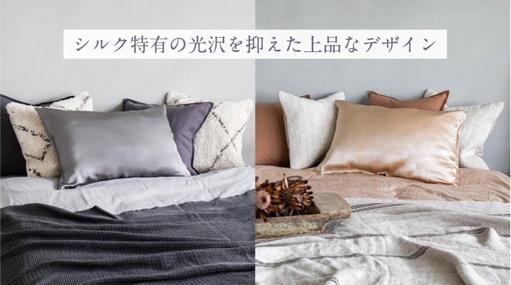商品の開発を進める中で、シルクのテカテカとした光沢が気になるというお声を数多く頂きました。今回はインテリアに合わせやすいように光沢を抑えた仕上がりとし、寝具に馴染みやすい色もグレーとベージュの2色展開となります。