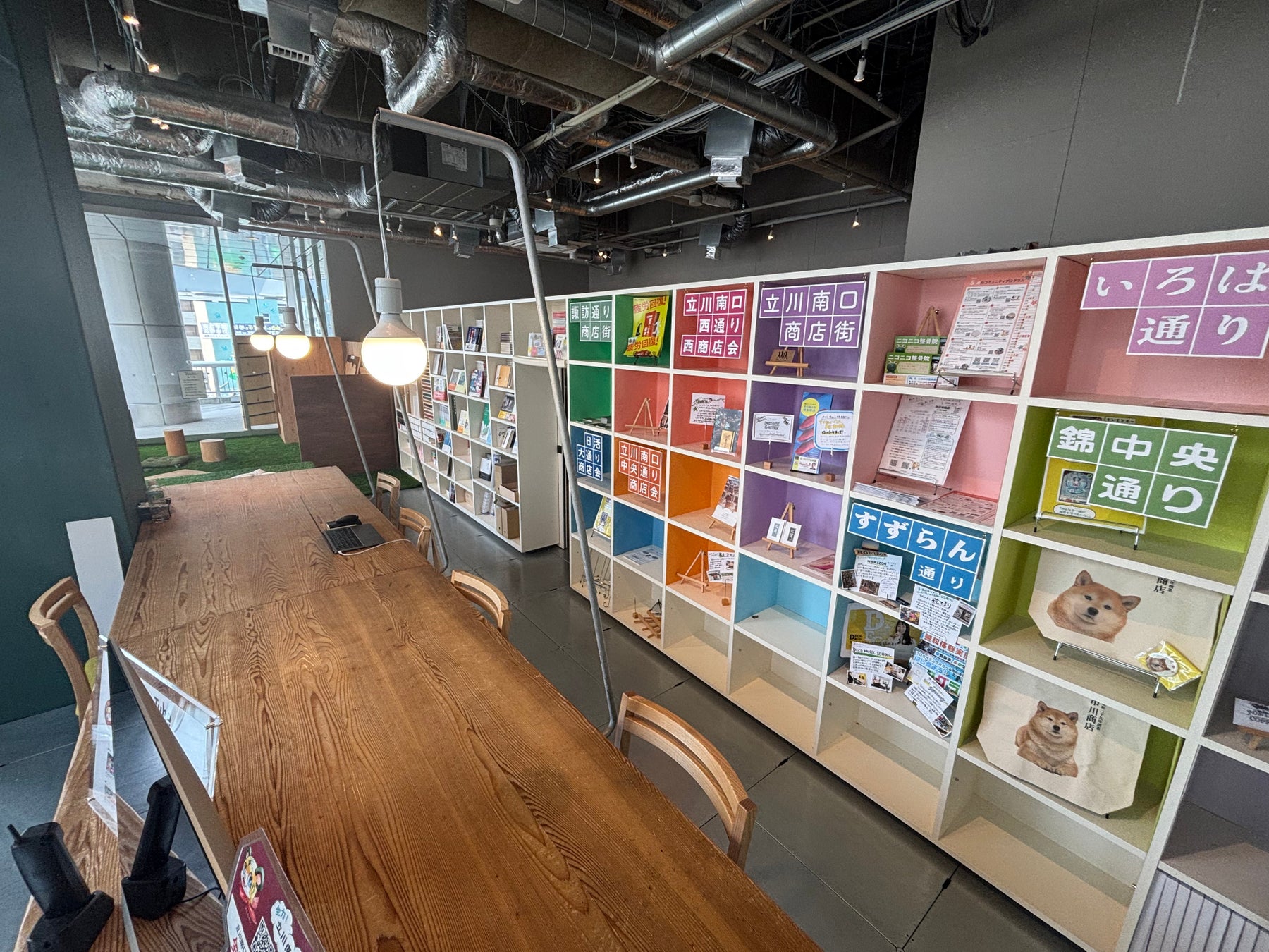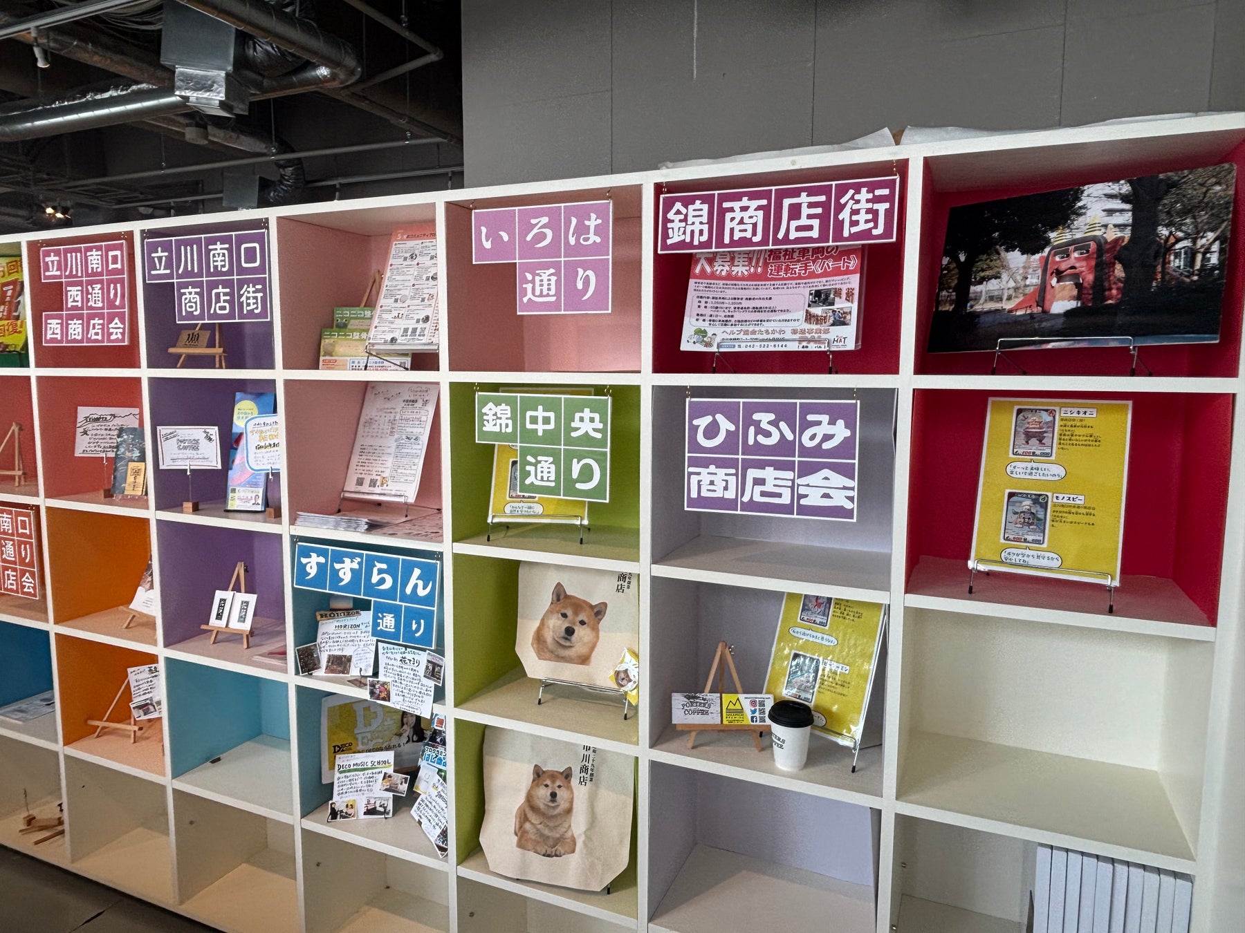 「商店街の棚」は立川南口に10ある商店街ごとの棚を設置した“小さな商店街”。立川南口の方々からお預かりしたショップカードやチラシ、キャンペーン情報などをストックし、みなみの窓口に訪れた方には「この店へ行ってみようかな」「こんなキャンペーンやっているんだ」といった発見になり、そこからリアルな商店街へ送客することで、来館者の満足度向上と商店街の活性化につなげます。