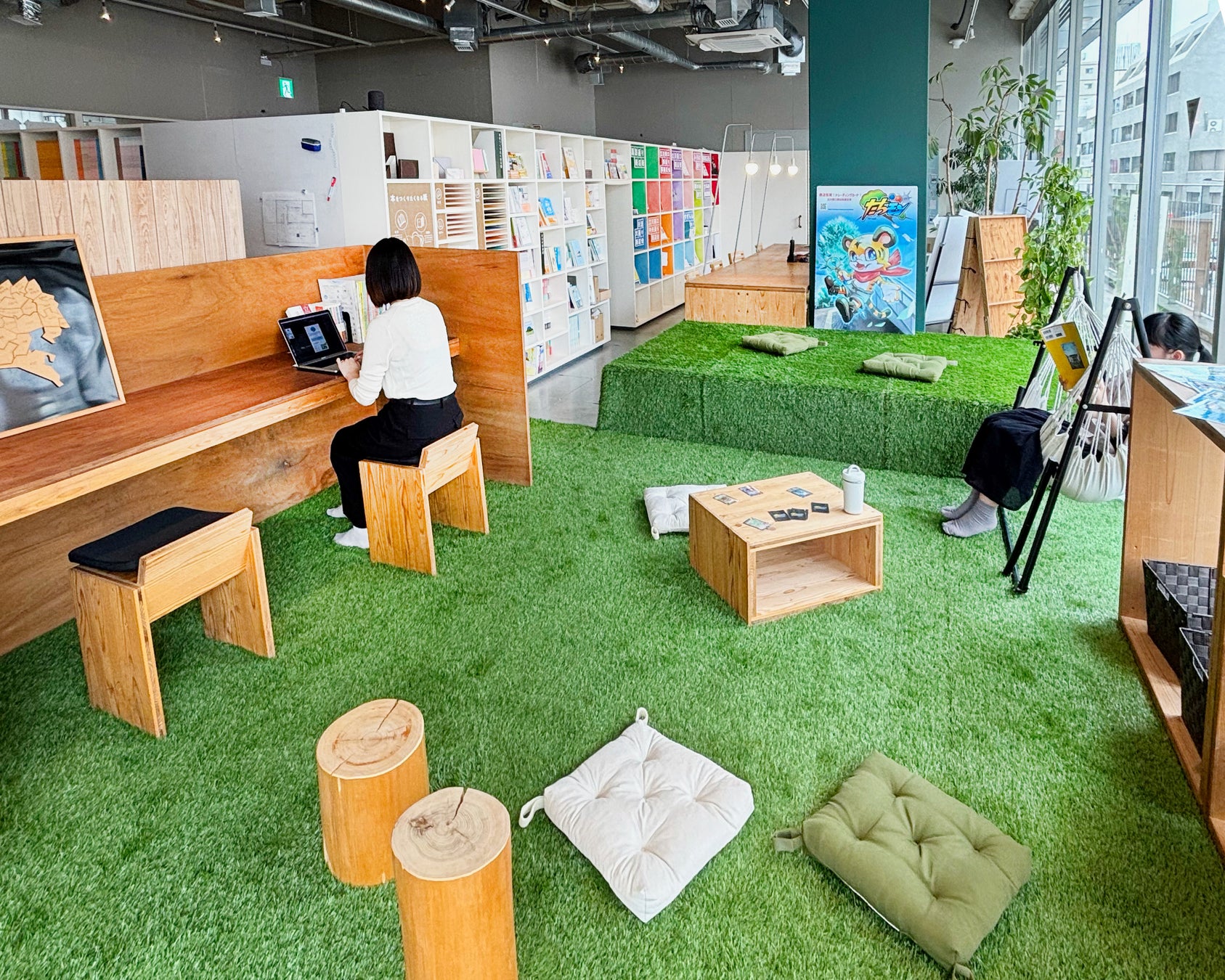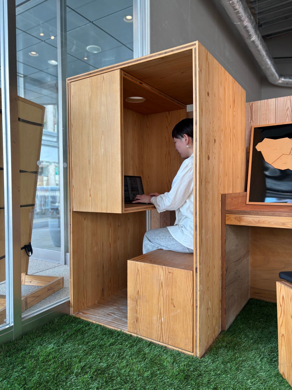 テーブル席の先は、開放感のある芝生エリアになっており、作業が煮詰まった際のブレインストーミングや、リラックスした空間で新しいアイデアを考えたい時にもぴったりの空間です。また、オンライン打ち合わせをしたい方や一人で集中したい際に利用できる個別ブース“机箱”も利用が可能です。