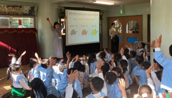 今年度も『楽しく!おいしく!学ぶブルーベリー出張授業』と題し、東京音楽大学付属幼稚園で園児34名、亀田幼稚園では園児70名を対象に出張授業を行いました。出張授業では、紙芝居やクイズを用いてブルーベリーを楽しく学び、最後はみんなで冷凍ブルーベリーをいただく試食で美味しく学びました。