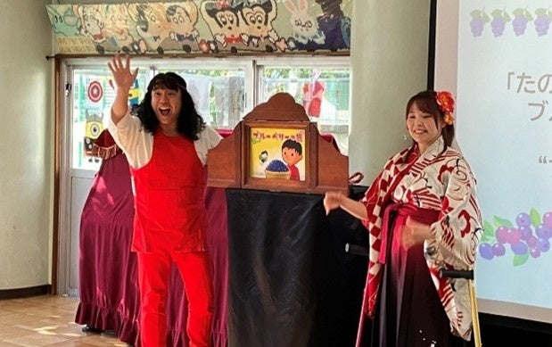 プロの紙芝居師集団「渋谷画劇団」が登場し、紙芝居『ブルーベリーの旅』を披露しました。上演中は園児たちと掛け合いを行うなど、会場一体となって楽しくブルーベリーについて伝えました。ブルーベリーが様々な料理にアレンジされていることを知ると、園児たちから驚きの声が上がる一幕もありました。