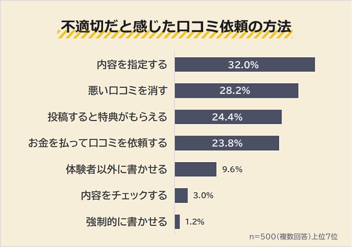 これまでに「不適切だと感じたことがある口コミの依頼方法」を聞いたところ、1位は「内容を指定する(32.0%)」でした。