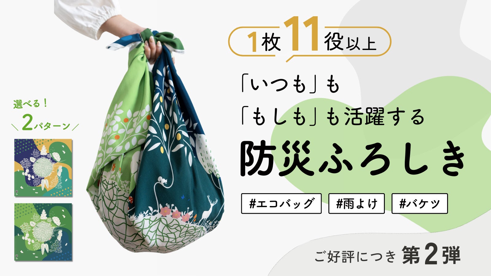 多くの反響をいただいた第1弾の防災ふろしきの販売から4年。多くの防災グッズも世の中に出回り、グッズを準備する人や家庭が増えました。そんな状況の中、さらにこれからは災害が起きた時に大事にいたらないライフスタイルを日ごろから送ることを多くの人々が意識することが大切であると私たちは考え、より日常になじむ第2弾の防災ふろしきの開発に至りました。