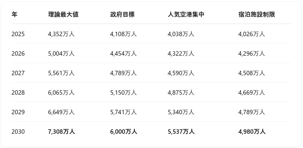 したがって、6000万人を受入空港の供給キャップとした際に、人気空港(羽田空港・成田空港・関西国際空港・福岡空港)のみが増加※滑走路拡張計画も考慮、非人気空港(4空港以外)が現時点での受入体制をキャップとした場合、2030年の訪日外国人観光客は5537万人と予測されます。