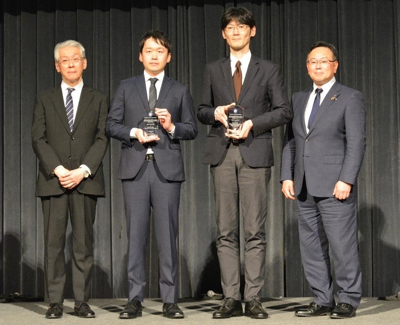 岩﨑 剣吾(いわさき けんご)先生、新潟大学医歯学総合病院高度医療開発センター 都野 隆博(つづの たかひろ)先生の2 名です。2 名の方々には特定非営利活動法人 日本歯周病学会理事長 沼部 幸博先生から日本歯周病学会歯周組織再生医学優秀発表賞の賞状が贈られ、科研製薬 取締役・研究開発本部長 綿貫 充より副賞としてKAKEN Awardのトロフィーと賞金が贈られました。