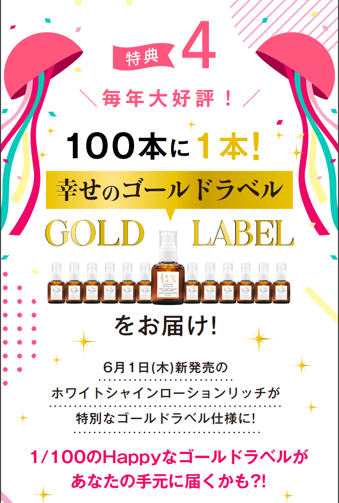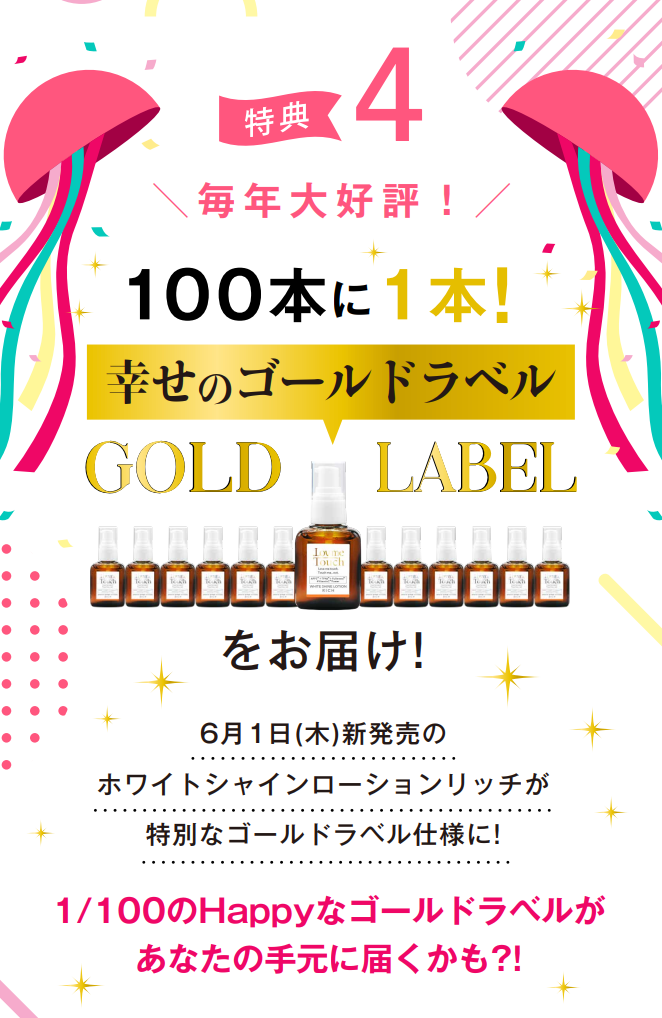 毎年大好評のラブミータッチ ホワイトシャインローション 「幸せのゴールドラベル」 がパワーアップして復活!期間中は6月1日(木)新発売の ホワイトシャインローションリッチが 特別なゴールドラベル仕様に!100本に1本「幸せのゴールドラベル」でお届けします。