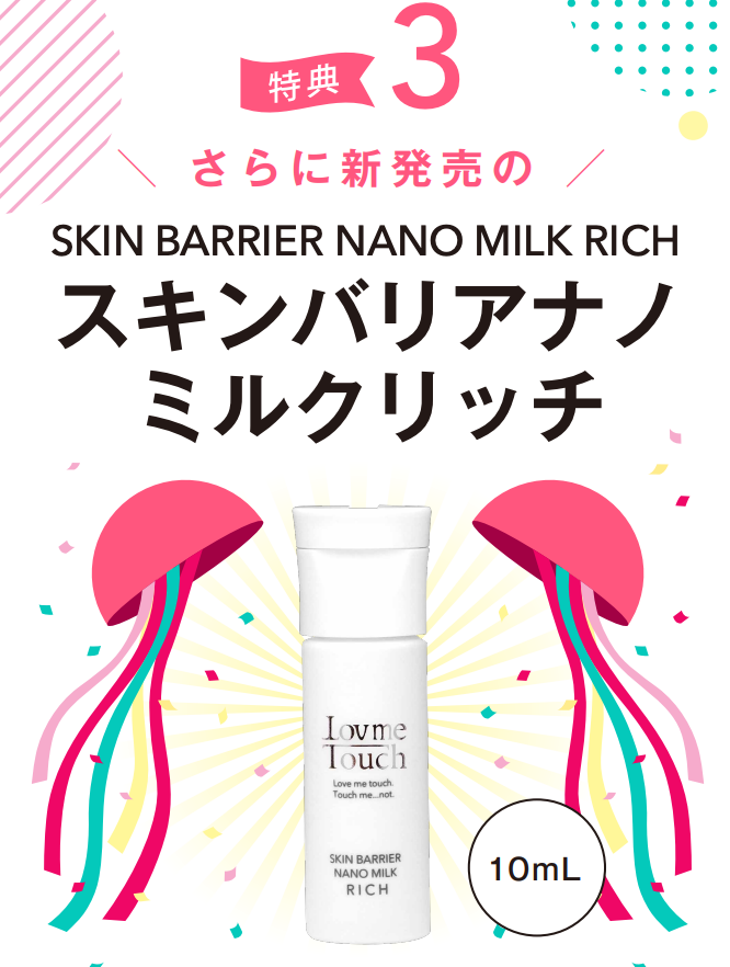 対象商品の商品代金合計が税込3万円以上で、6月1日(木)新発売スキンバリアナノミルクリッチ(乳液)10mlを全員にプレゼント!