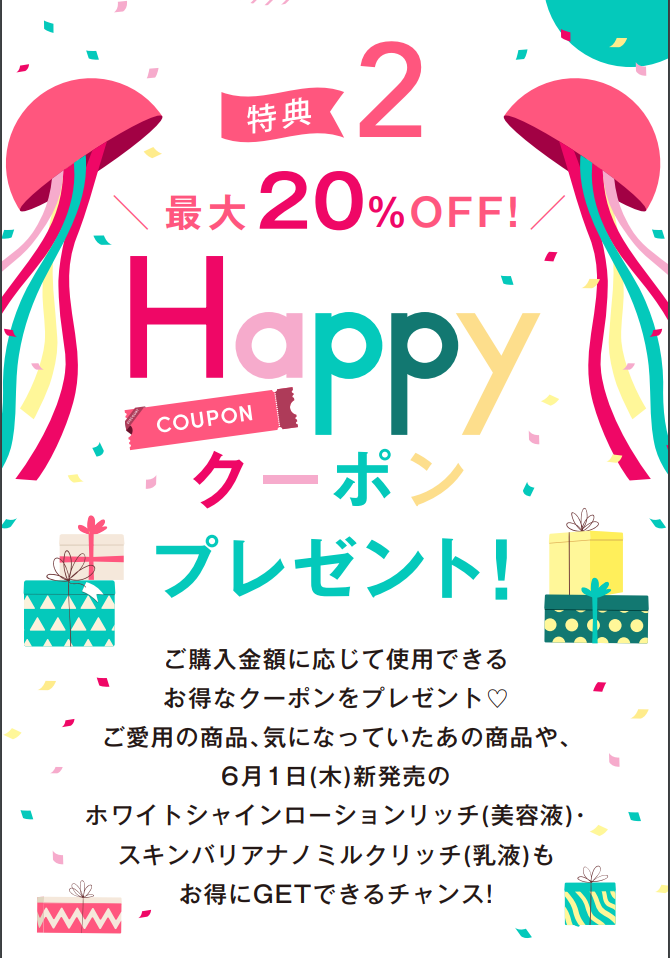 Lov me Touch、reveillerシリーズ ご購入金額に応じて使用できるお得なクーポンです。 6月1日(木)新発売のホワイトシャインローションリッチ(美容液)・ スキンバリアナノミルクリッチ(乳液)もお得にGETできるチャンス!