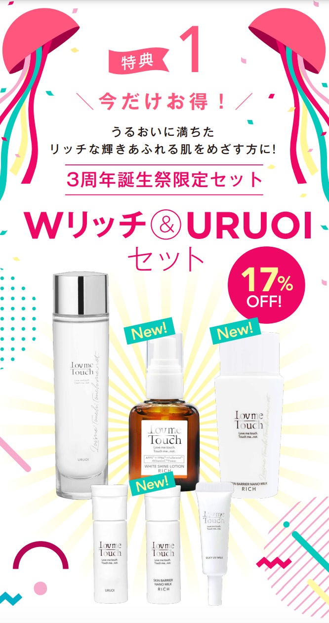 新発売となる「スキンバリアナノミルクリッチ」「ホワイトシャインローションリッチ」2製品とHA4配合化粧水「URUOI」にプラスして、ラブミータッチ化粧水・美容液・乳液の 3点に今だけミニサイズが入った限定セット。