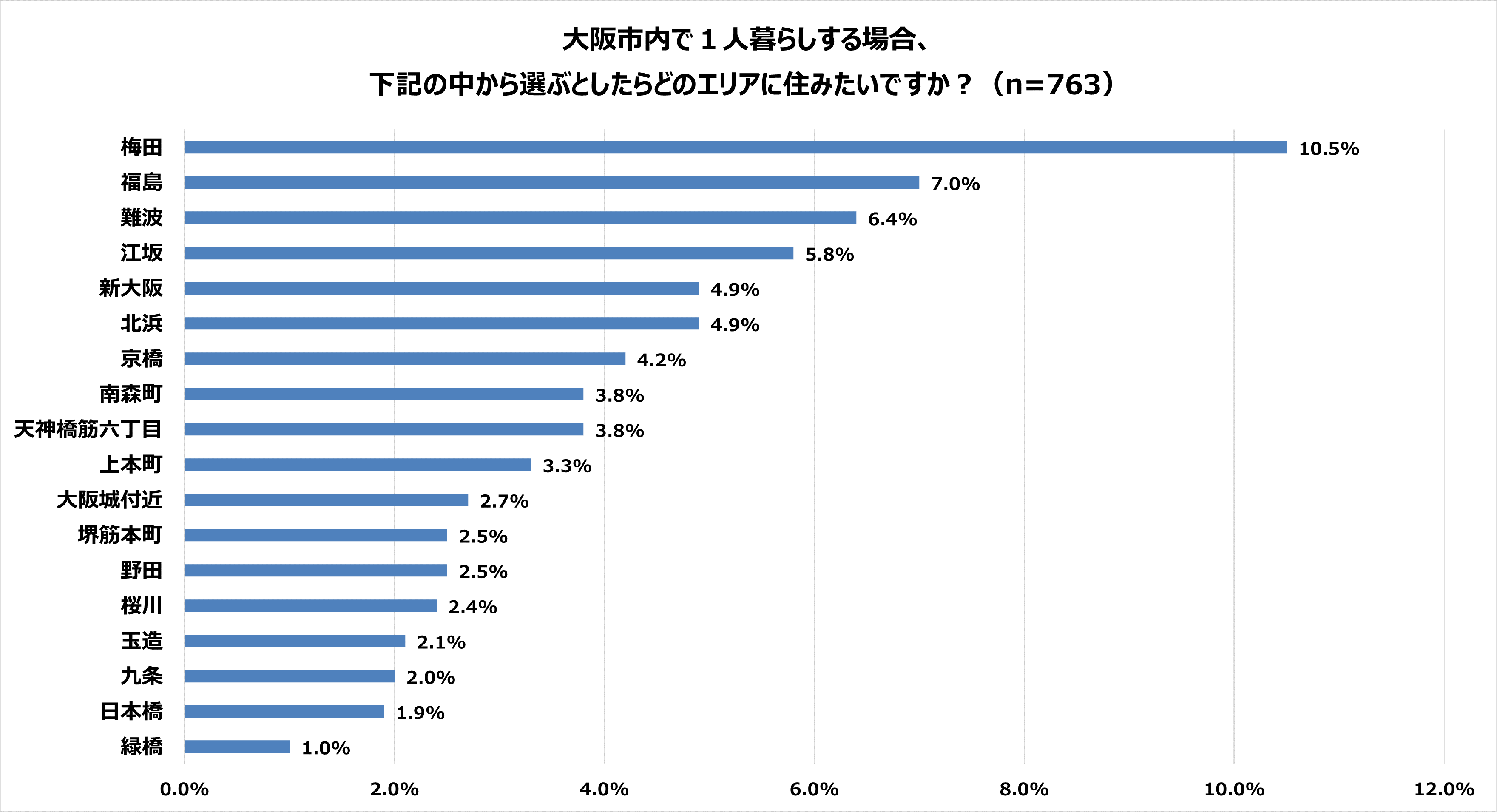 梅田が1位も30代は僅差で福島が2位 住環境・繁華街が近いこと双方重視 ファミリーと比べて1人暮らしはニーズが分散する傾向