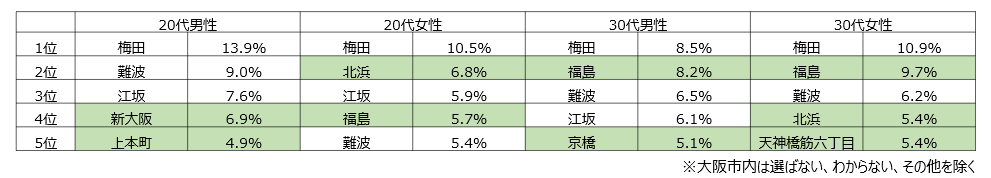 20・30代男女別のランキングを見てみると、1位が梅田エリアであることは一致しているものの、30代では1位と僅差で福島が人気であることがわかりました。20代女性は、他の世代・性別と異なり2位に北浜がランクイン。加えて、20代女性は20代男性や30代で人気の難波エリアが5位という結果となり、より他の世代や性別と差が出る結果となりました。