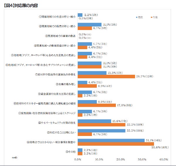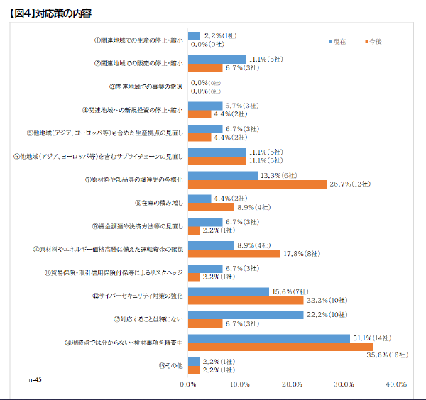 ○「現時点(準備中を含む)での対応策」の内容は、「サイバーセキュリティ対策の強化」15.6%(7社)、「原材料や部品等の調達先の多様化」13.3%(6社)、「関連地域での販売の停止・縮小」11.1%(5社)、「他地域(アジア、ヨーロッパ等)を含むサプライチェーンの見直し」11.1%(5社)等。