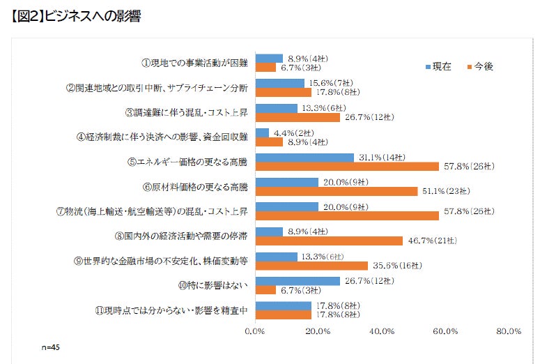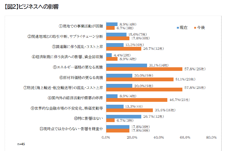 ○ 「現在の影響」については、「エネルギー価格の更なる高騰」31.1%(14社)、「原材料価格の更なる高騰」20.0%(9社)、「物流(海上輸送・航空輸送等)の混乱・コスト上昇」20.0%(9社)、「関連地域との取引中断、サプライチェーン分断」15.6%(7社) 、「調達難に伴う混乱・コスト上昇」13.3%(6社) 、「世界的な金融市場の不安定化、株価変動」13.3%(6社) 等。