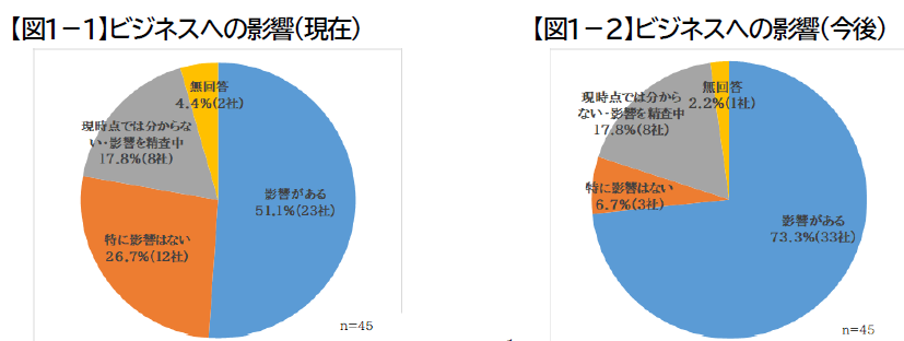 ○ 「現在影響がある」と回答したのは5割超(51.1%、23社) 。
