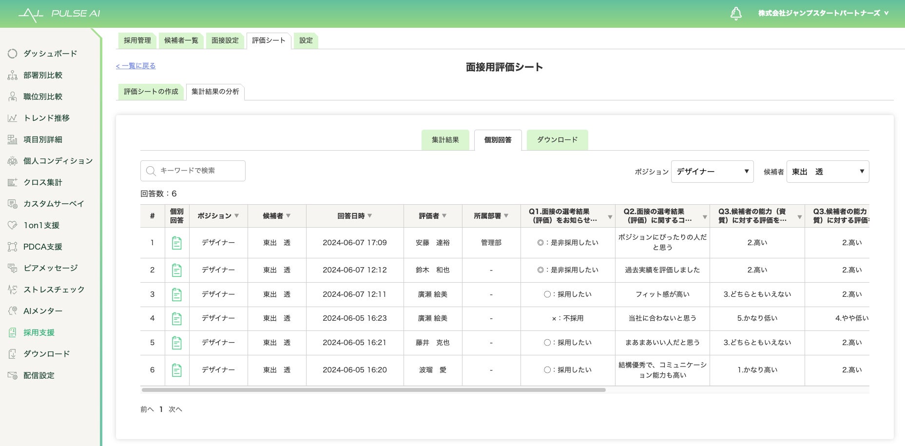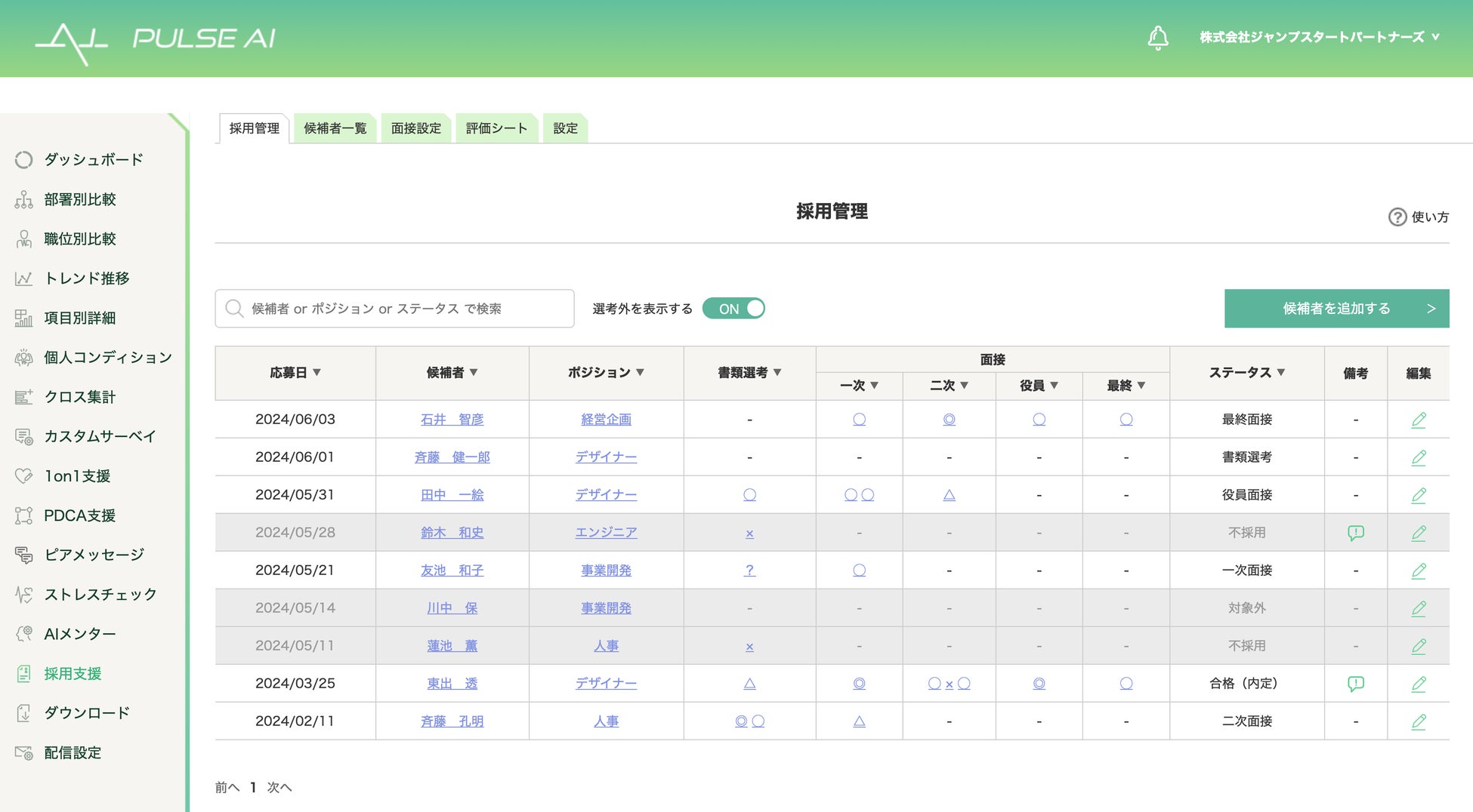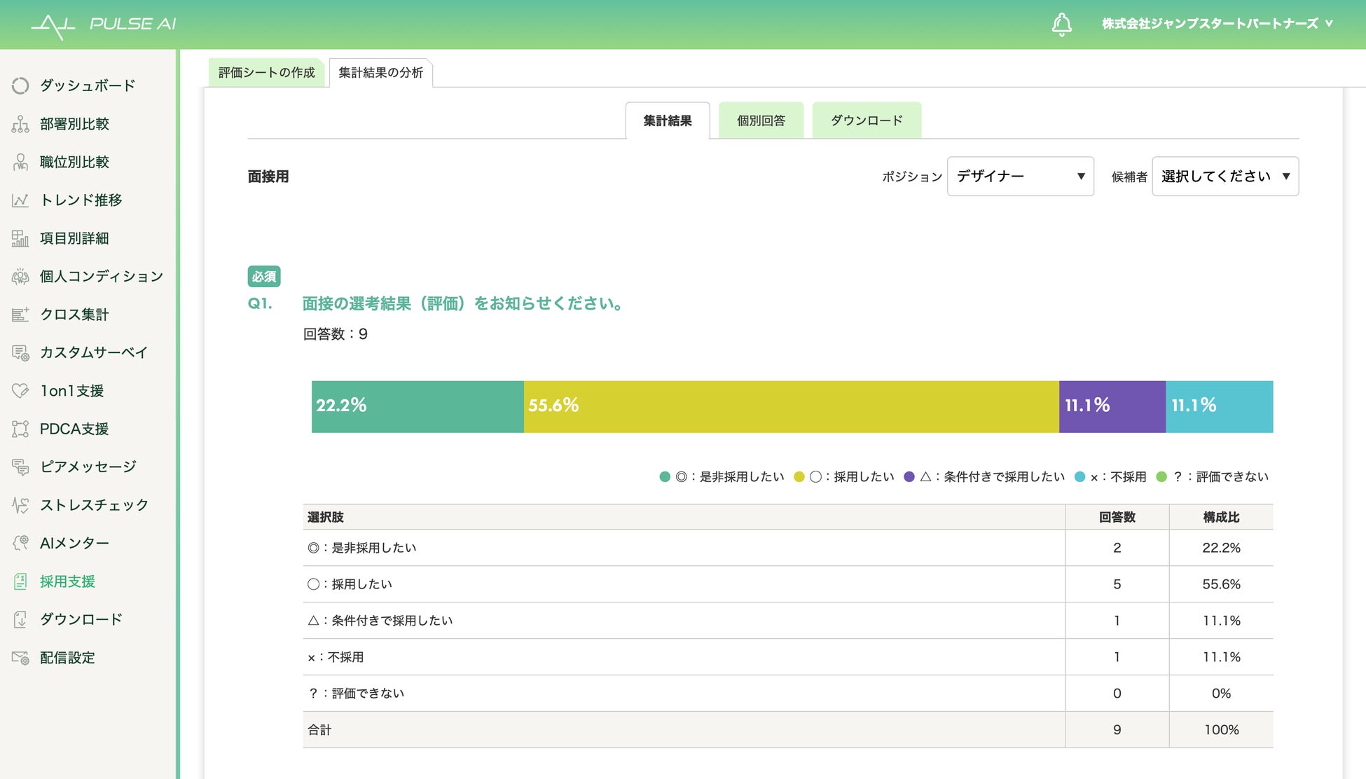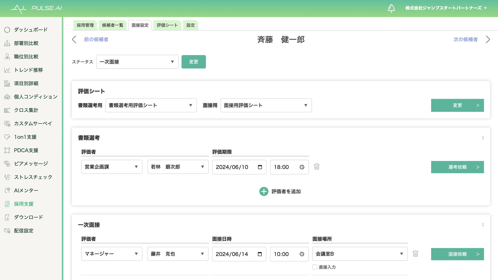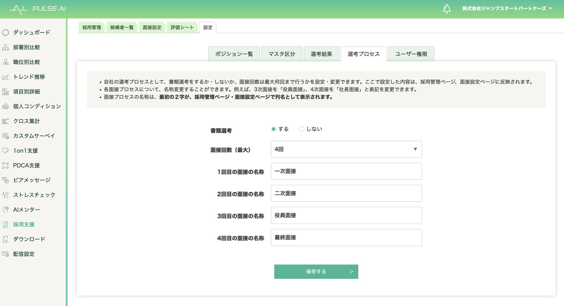 株式会社ジャンプスタートパートナーズ(本社:神奈川県横浜市、代表取締役:安藤 達裕)は、離職率改善・マネージャー育成に役立つ組織改善ツール「PULSE AI(パルスアイ)」をさらに便利にする「採用支援機能」の提供を開始したことをお知らせします。採用支援機能では、候補者情報の管理、採用プロセスの進捗共有、面接設定と面接依頼、面接結果の管理、評価シートの作成と回答データの集計分析、ポジション情報の管理などが行え、企業における採用のミスマッチ防止に貢献します。