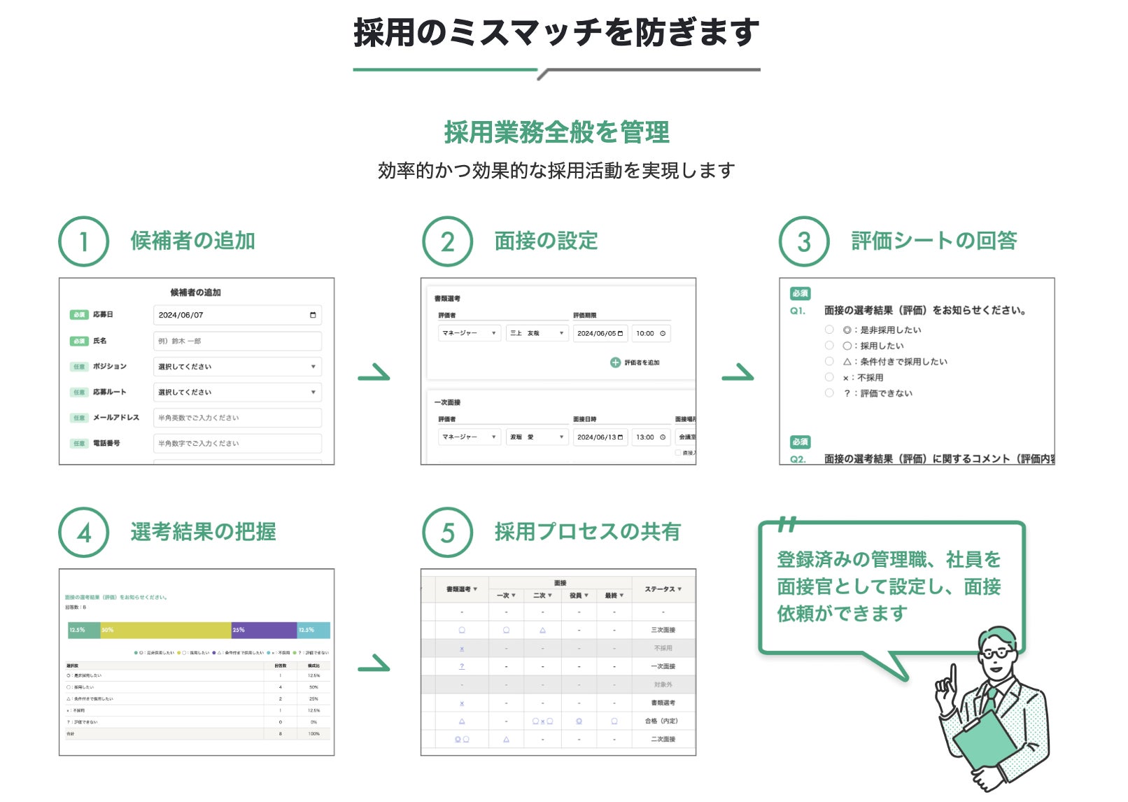 候補者に対する選考結果をデータで比較することで、採用or不採用の判断基準を統一化し、採用ミスマッチを減らすことにつながります。