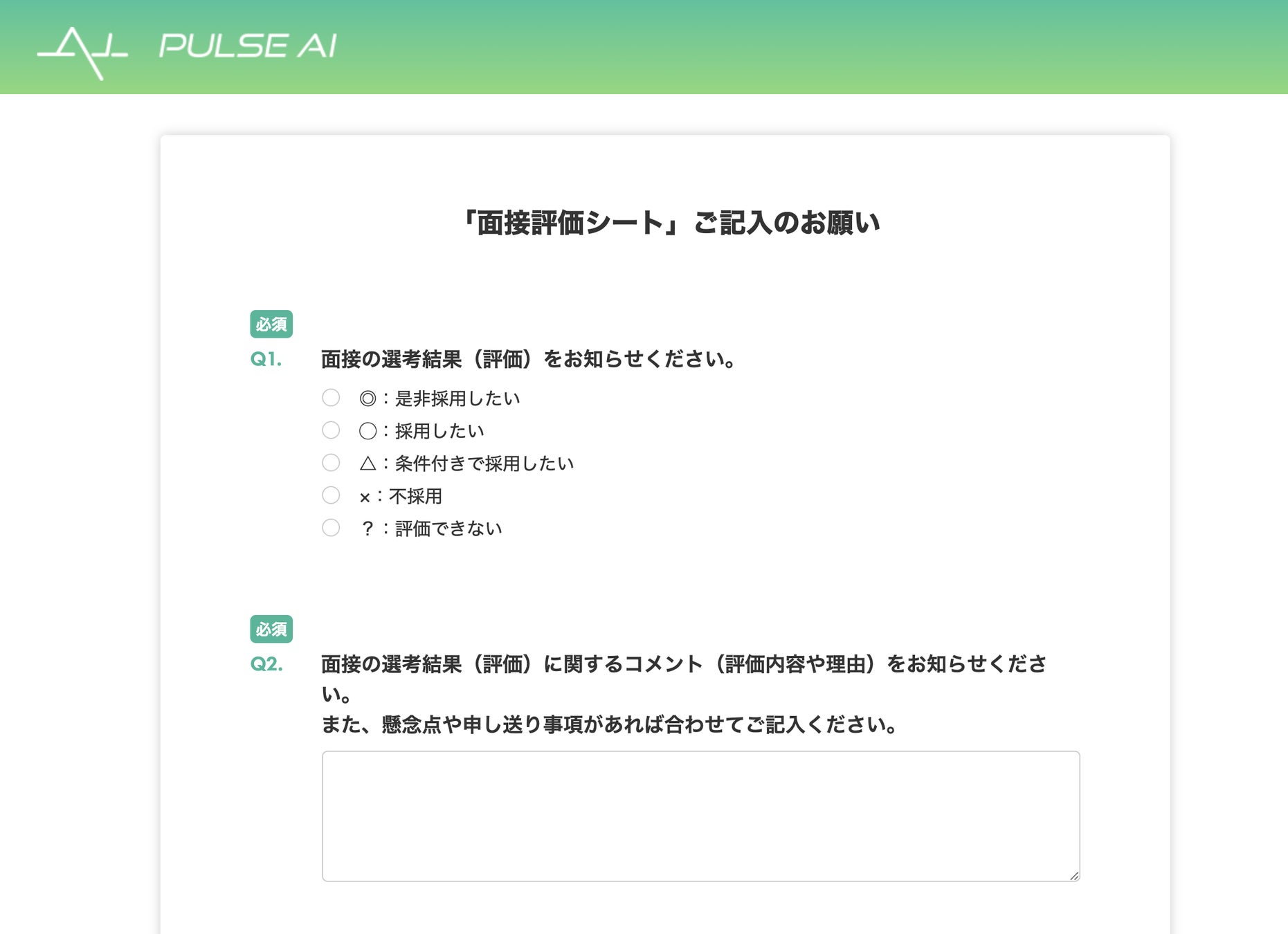 会社独自の評価シートを作成することで、書類選考や面接の評価軸・評価方法を統一できます。評価シートの回答は、アンケート形式なので、評価者はPCやスマホから、候補者に対する選考結果を回答します。