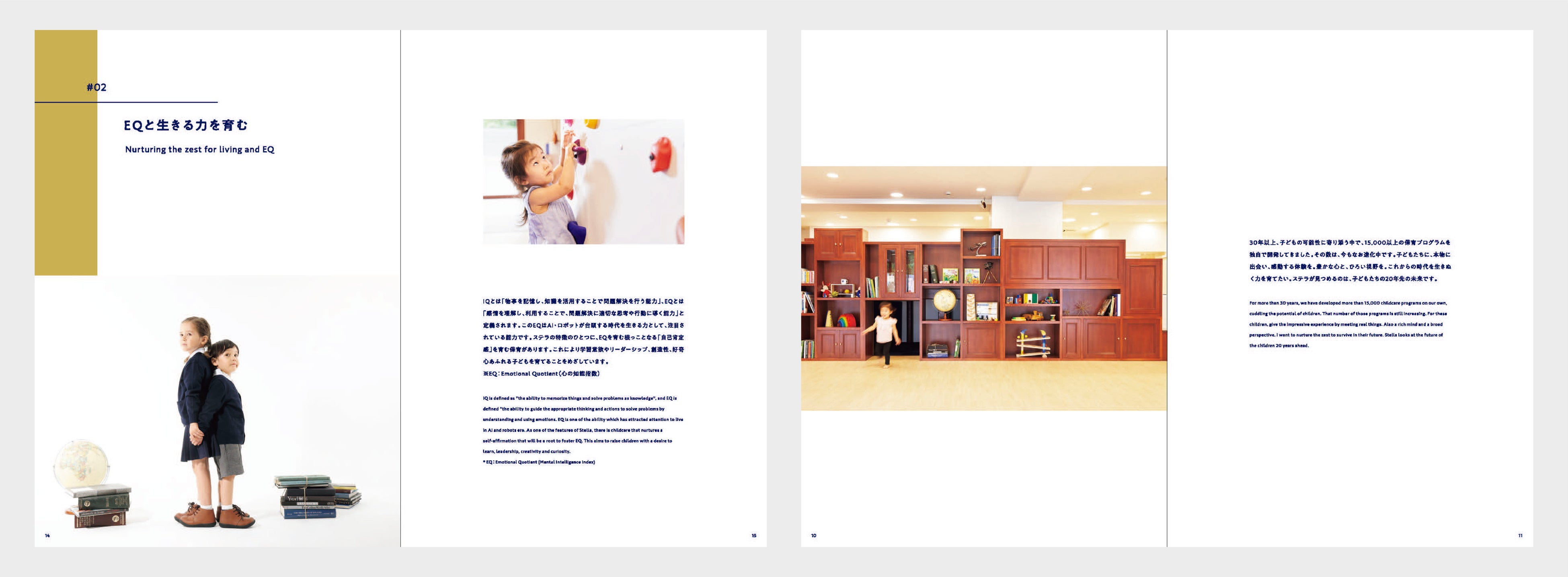 英語、体育、音育、食育など各界のプロフェッショナル監修によるプログラムを通して、子どもたちに「本物」を届ける。この日々の感動体験を通して、子どもたちの感性に磨きをかけていきます。そして世界とつながる「視野の広さ」と「豊かな心」を高次元に養うこと、それがステラプリスクールの本気保育が目指すゴールです。今回のパンフレットでは、私たちの大切にしている考え方が少しでも多くの方に伝わるよう設計いただきました。