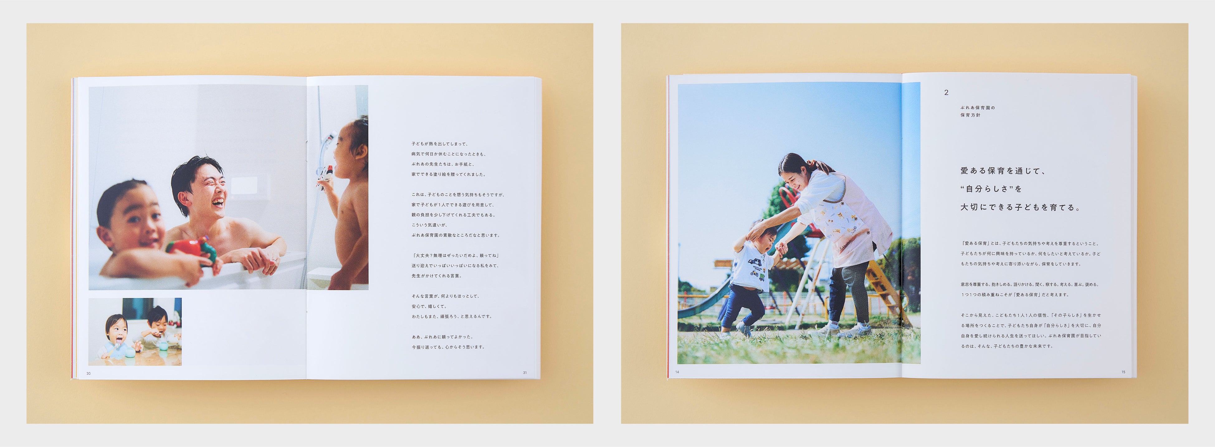 ぶれあ保育園の目指す保育のあり方である「ともに愛する。ともに育てる。」を表現した、ブランドブックです。ぶれあ保育園は、真に向き合うべきユーザーを、「家庭」そのものだと考えています。このブランドブックでは「保育園として提供している本当の価値とは何か」を、保育園と保護者の視点から描くことで、より立体的に表