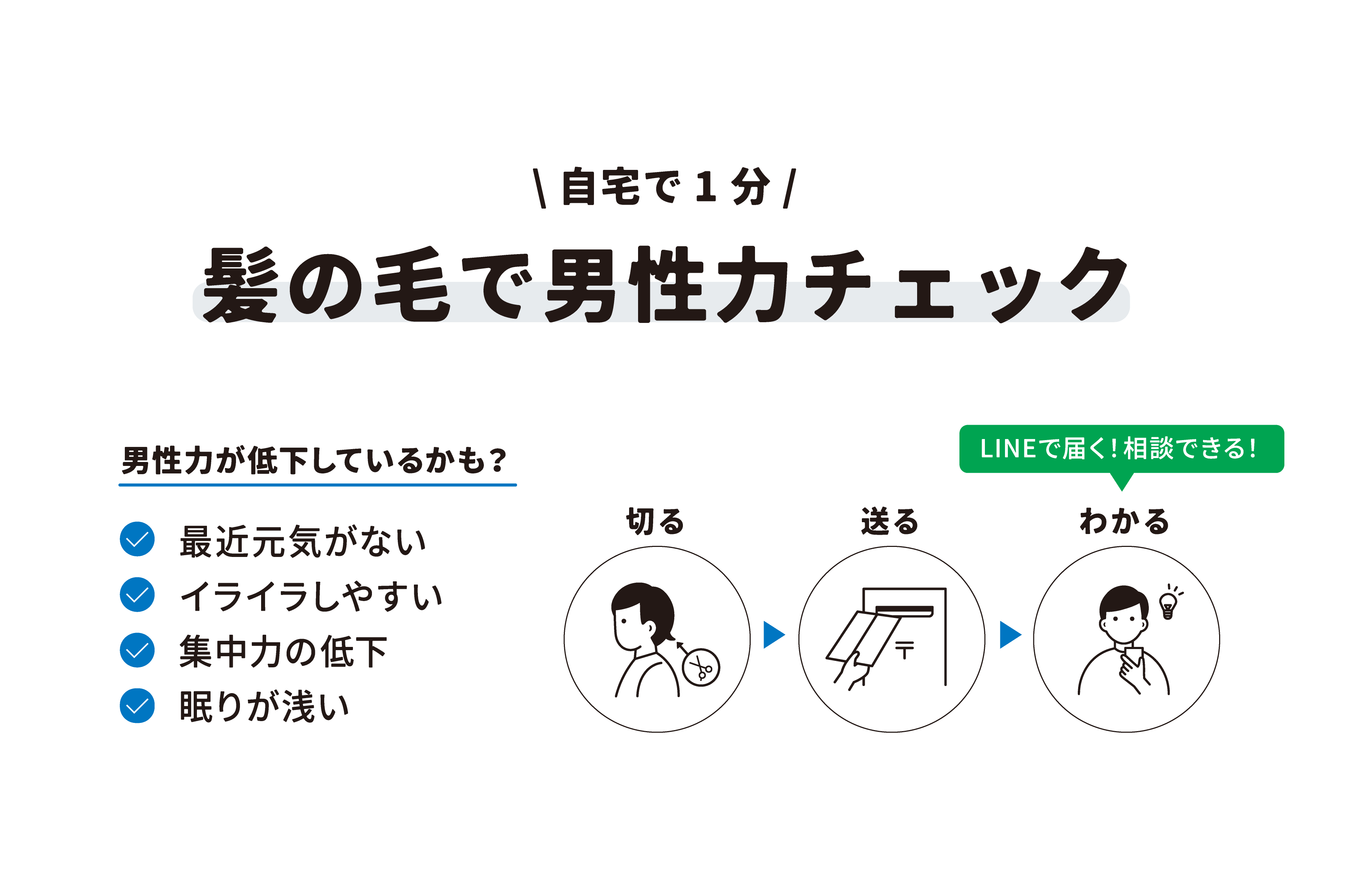 男性ホルモンの代表格テストステロンの数値を髪の毛で簡単にチェックできる「MENOPO CHECK FOR MEN」。40代以降の心身の不調の要因、テストステロンの減少である男性更年期を手軽にチェック