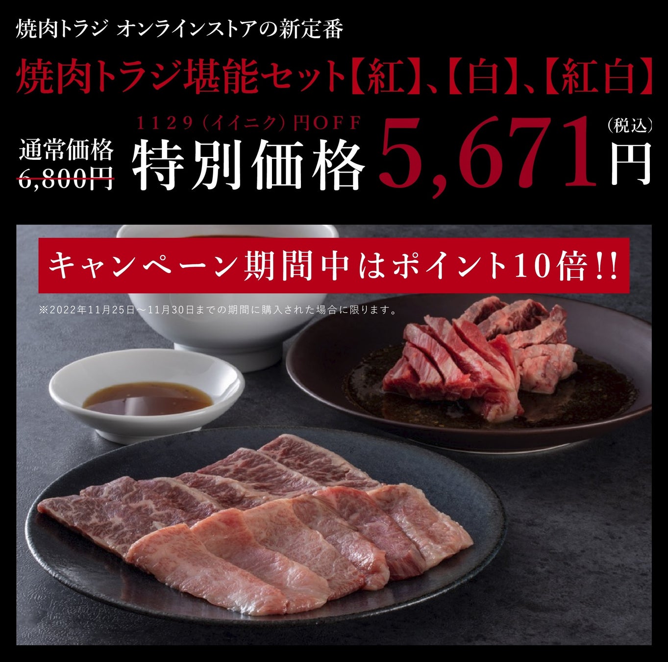 株式会社トラジ(本社:東京都江東区、代表取締役社長:金 信彦)は、公式通販サイト(焼肉トラジ オンラインストア)にて11月29日の「いい肉の日」を含む、2022年11月25日(金)~11月30日(水)の6日間、通常6,800円の「焼肉トラジ堪能セット」を1,129円引きの5,671円(税込)での販売をはじめ、全商品のお買い物ポイントが10倍となるキャンペーンを開催いたします。