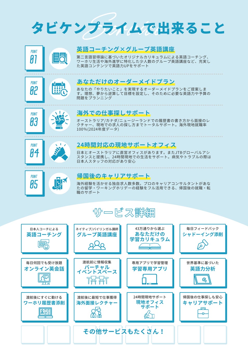 タビケン留学では、ワーキングホリデーや留学を希望する方に向け、渡航前の英語学習から現地生活、帰国後のキャリア支援までを包括的にサポートする新サービス「タビケンプライム」を2024年12月1日にリリースしました。