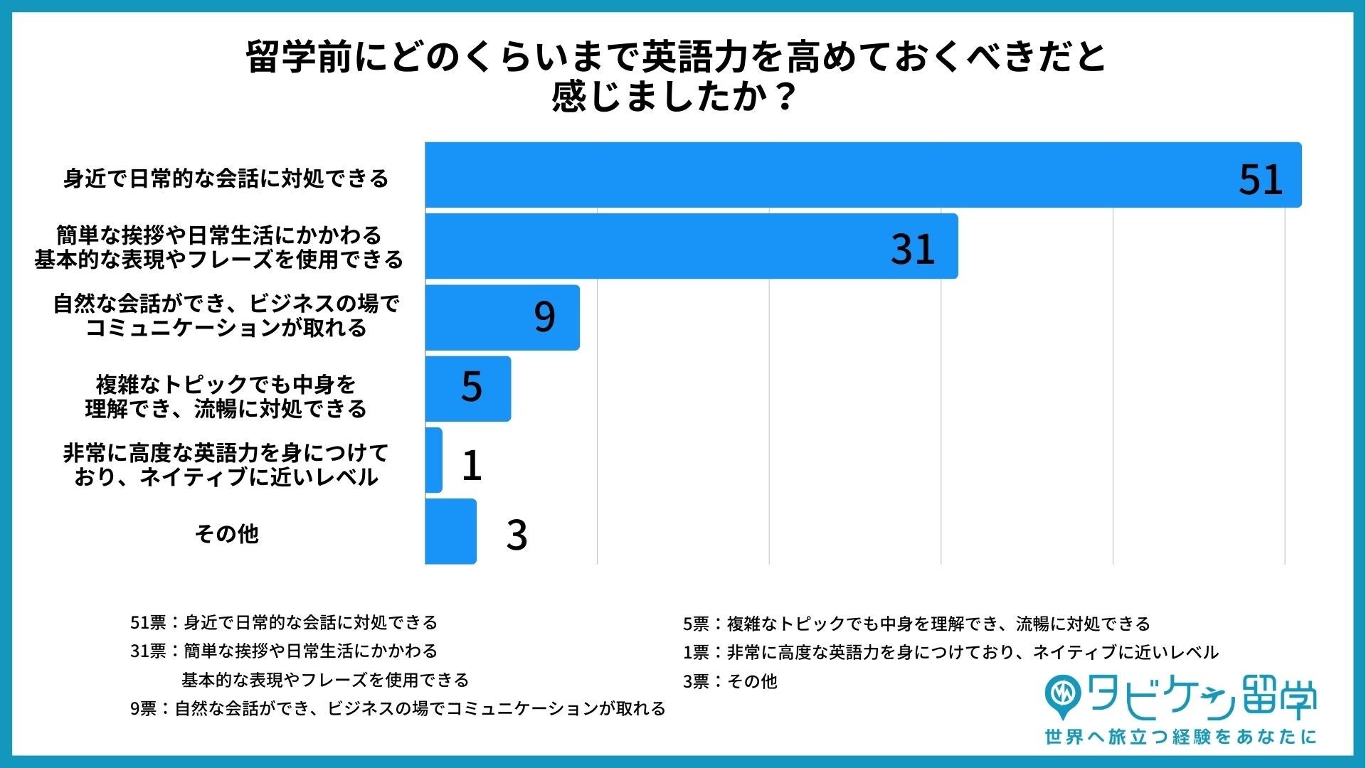 今回の結果から、多くの人が留学前に英語学習を必要と感じていましたが、求めるレベルは日常会話ができる程度で十分だと考える傾向があることが明らかになりました。