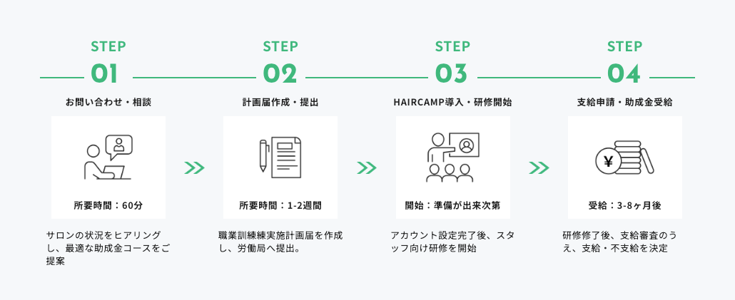 ヘアキャンプで人気の講師陣が直接指導する集合研修や講師派遣型研修を通じて、技術から接客、集客、マネジメントまでを体系的に学べるプログラムを提供します。さらに、各種助成金の活用により、受講料の最大約75パーセントが助成される可能性があり、サロンの教育コストを大幅に抑えながら人材育成を進めることができます。