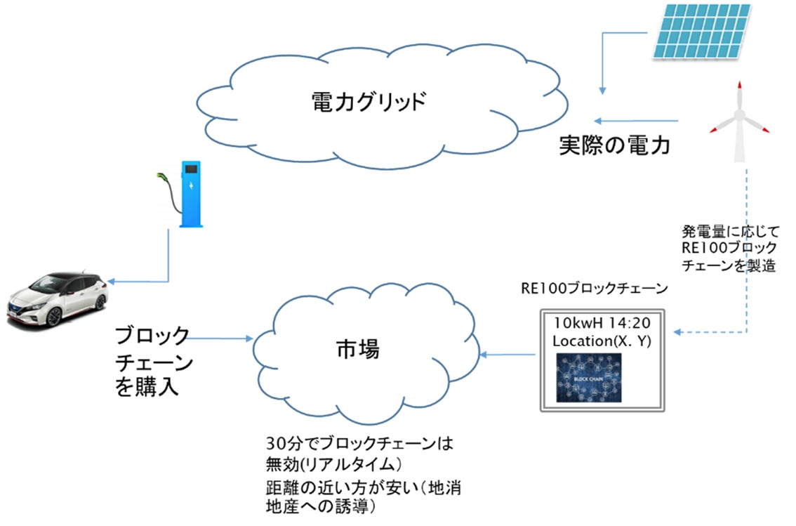 現在は、スタティックな排出権のように、森林でのCO2吸収や、再生可能電力の証明書(以下、証明書)を利用し、クリーンな電気自動車を利用する動きがあると同時に、そこで利用される証明書の信頼性の問題がありました。本来であれば、太陽光発電機から直接電気自動車に充電する方法が理想的ではあるものの、時間や場所の制限の大きさという課題があり、その方法は現実的ではありません。そこで本共同研究では、単に証明書の正確さをブロックチェーンで実現するのではなく、場所や時間(同時同量制御)を詳細に考慮し、需給状況(現在の電力不足や系統不安定性)を、経済原理と組み合わせ、最適にコントロールすることを狙いとしています。