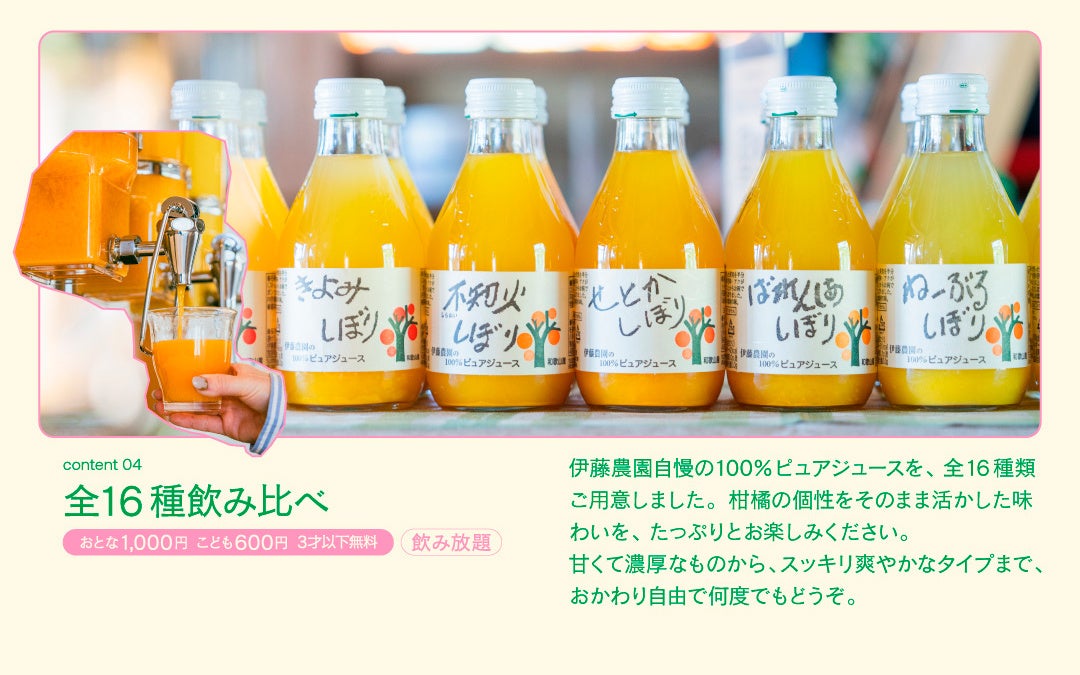 伊藤農園の豊富な16種類の柑橘ジュースを飲み放題でお楽しみいただけます。