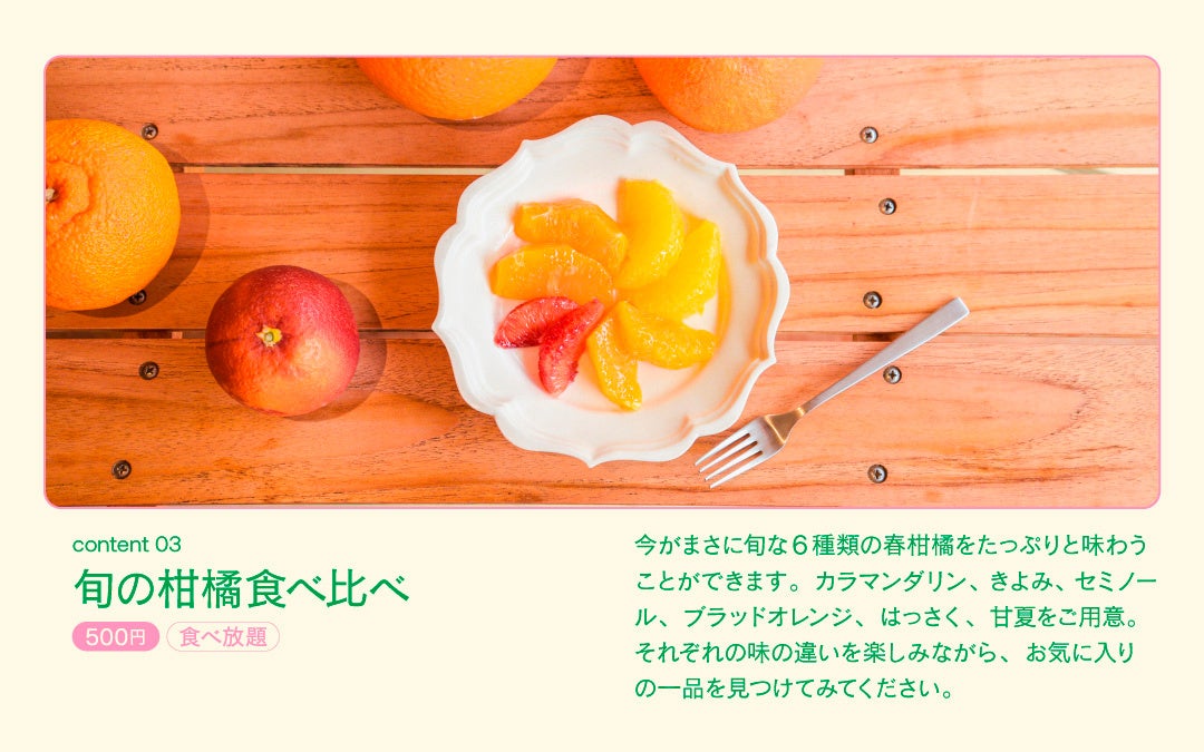 カラマンダリンをはじめ、春の旬の柑橘6種を食べ比べできます。