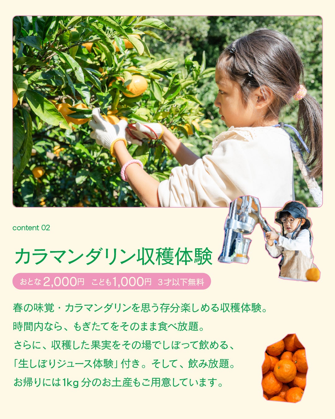 また、収穫したカラマンダリンの生搾り体験もお楽しみいただけます。