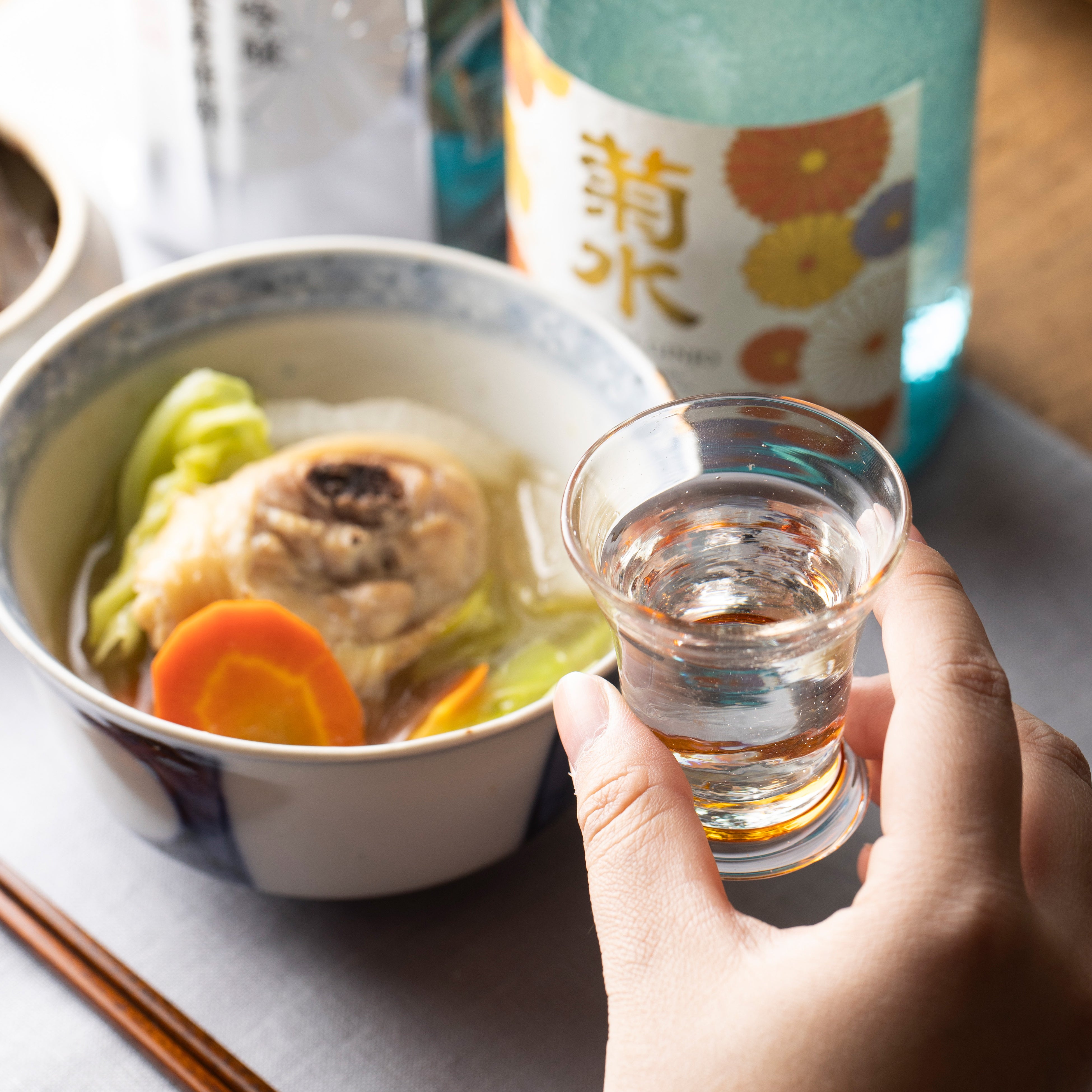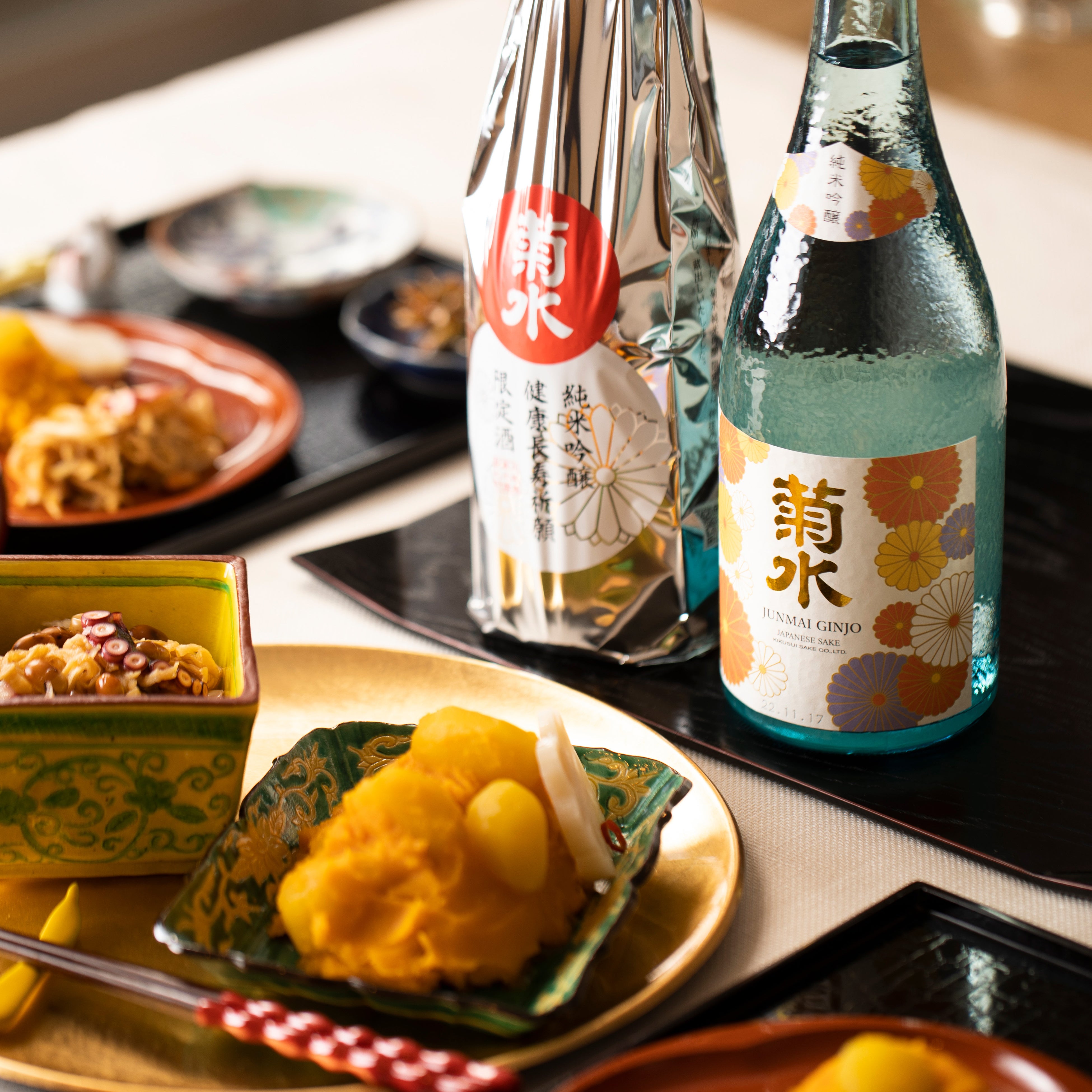 菊水酒造の酒銘「菊水」は、能楽『菊慈童』で不老長寿をもたらすとされた「菊の水」に起源があります。不老長寿に因む酒銘を冠した「菊水 純米吟醸限定酒」は、皆さまの健康・長寿を祈願して蔵出しした特別なお酒です。ブルーのボトルに菊の文様をあしらった晴れやかなデザインは、年末年始の華やかな食卓やお祝いの席を一層鮮やかに彩ります。