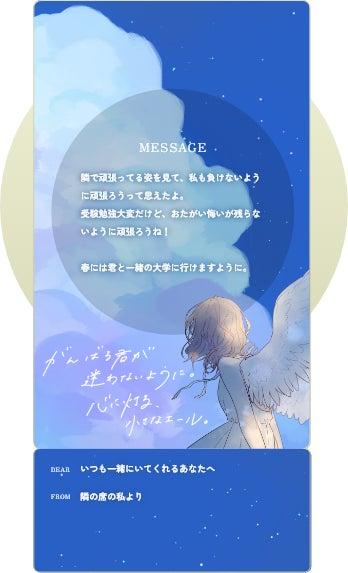 こうした活動の中で高校生から、すでに頑張っている時にかけられる「頑張れ」という言葉に負担を感じるという意見や、不安な気持ちに寄り添ってもらいたいといった意見が寄せられ、高校生の声をもとに、熱いエールで鼓舞するのではなく、受験生の心にそっと寄り添う温かなエールになるよう本サイトを制作いたしました。デザイン面については、夜をイメージした落ち着いた色合いと、願いが叶うという意味を込めて流れ星が降る仕様となっております。