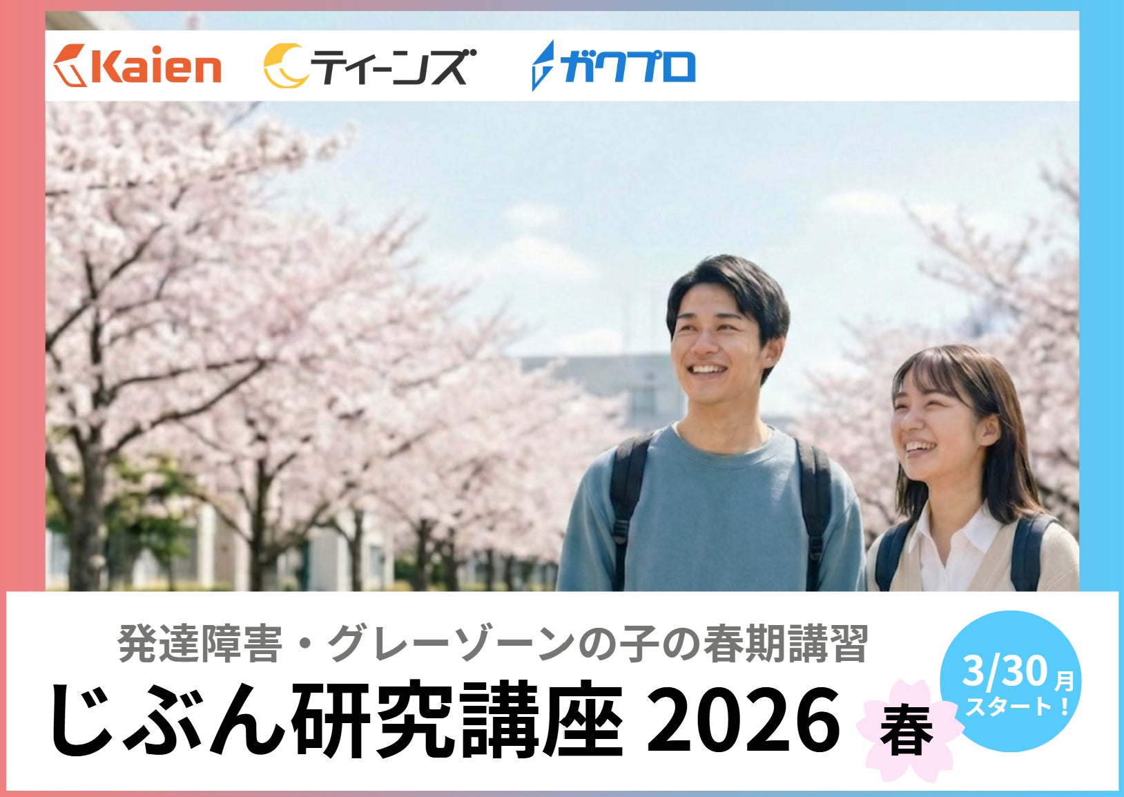 株式会社Kaien(本社:東京都新宿区、代表取締役:鈴木慶太)が運営する、発達障害のある小中高生向け放課後等デイサービス「ティーンズ」および大学生向け支援「ガクプロ」は、2026年3月30日(月)から4月3日(金)までの5日間、オンラインプログラム「じぶん研究講座2026春」を開催いたします。