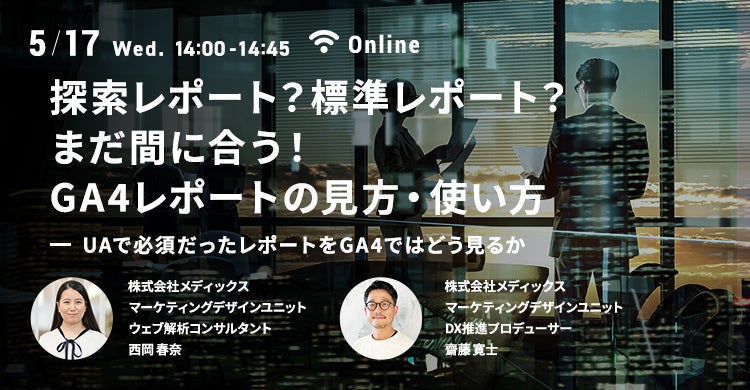 株式会社メディックス(本社:東京都千代田区、代表取締役:田中正則)は、Webマーケティングの担当者様・事業責任者様向けに オンラインセミナー【『探索レポート?標準レポート?まだ間に合う!GA4レポートの見方・使い方』~UAで必須だったレポートをGA4ではどう見るか~】を開催いたします。