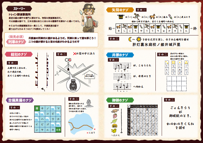 参加者は列車内に掲示された謎と沿線の「総社駅」「吉備真備駅」「矢掛駅」「井原駅」「御領駅」の周辺で謎を解きながら6つの合言葉を集めます。