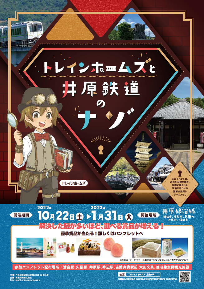 (株)BOUKEN WORKS(代表取締役:吉野 禎央、東京都渋谷区)は、井原線沿線観光連盟が主催し、青葉印刷株式会社が企画する謎解きイベント『トレインホームズと井原鉄道のナゾ』の制作を担当いたしました。
