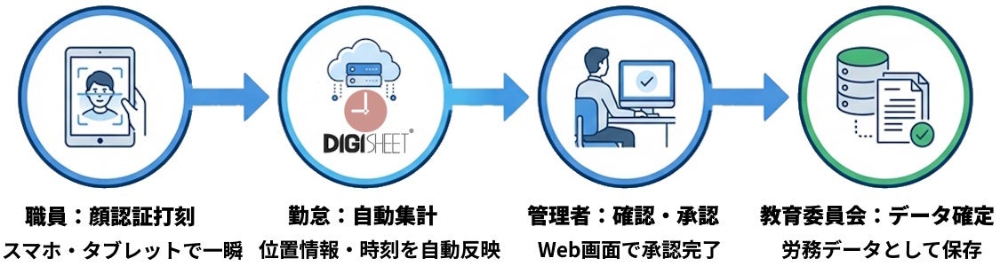 これらの課題に対応するため、湯浅町教育委員会は「DigiFaceAI」と「DigiSheet」を導入し、スマートフォンやタブレットからも出退勤の打刻や勤務記録の登録ができる環境を整備しました。これにより、場所を問わず勤怠記録が可能となり、打刻忘れや記録漏れの防止につながるとともに、複数校を兼務する職員や出張勤務など、多様な勤務形態にも柔軟に対応できる体制を構築しています。