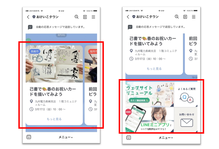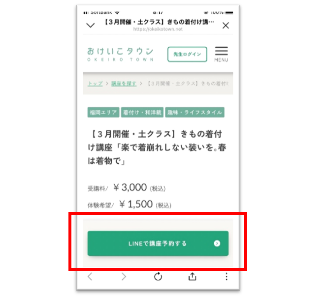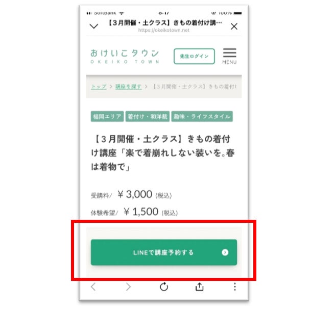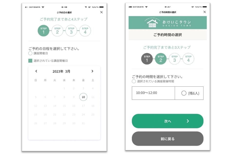 「おけいこタウン」の会員はLINE公式アカウントとお友だちになることで、LINE内で予約から講座の決済まで行うことができます。また、公式アカウントでは常に最新情報をメッセージでお知らせしているので、講座を見逃す事はありません。LINEでお知らせされた講座の中に気になるものを見つけたら、その講座をタップして都合の良い日時を選択し必要情報を入力することで、決済まで完了します。“習いたい人”にとっては手軽で負担が少なく、“教えたい人”にとっては効果的に講座をアピールすることができる、両者にとってwin-winなサービスが実現しました。