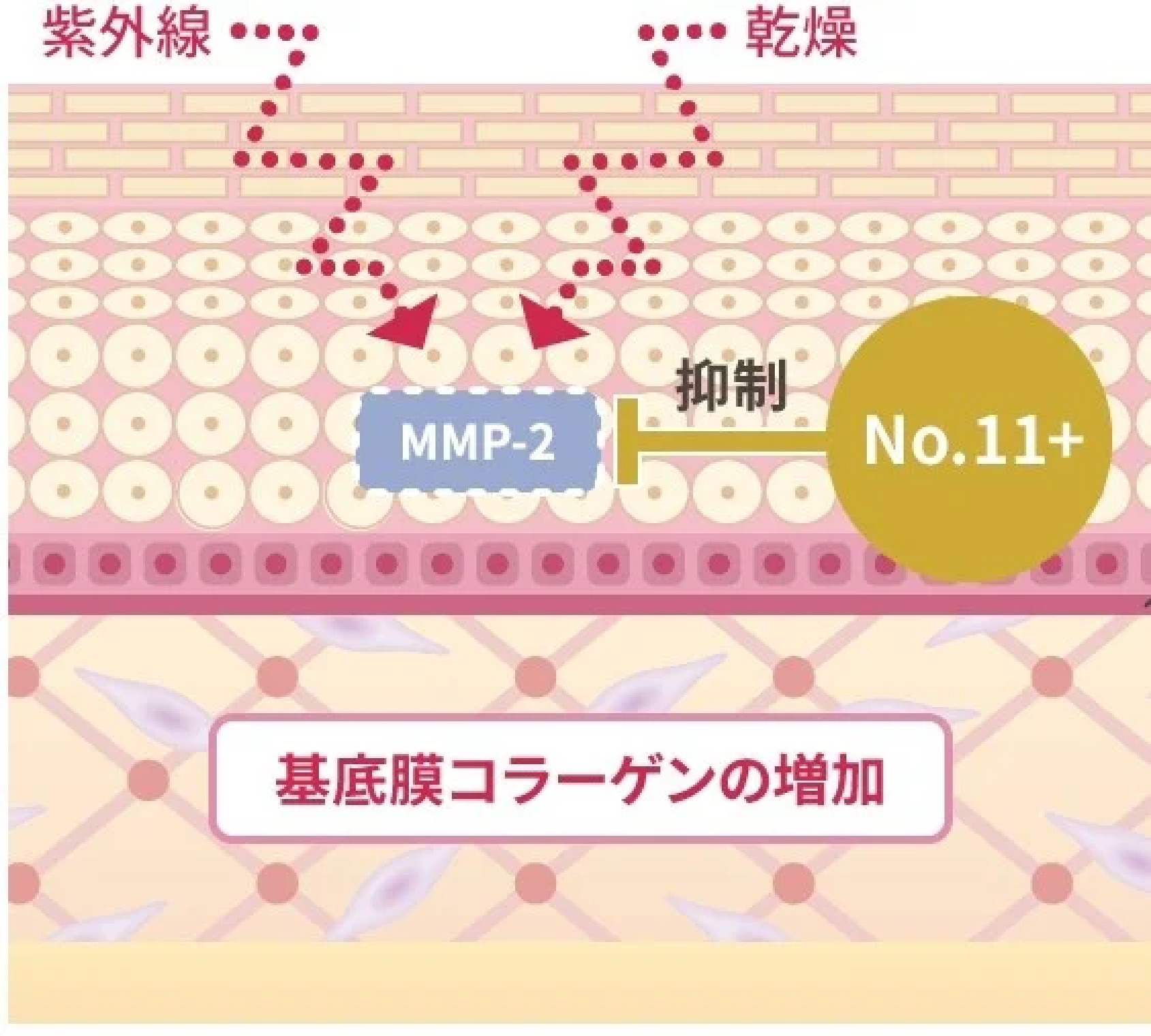 基底膜は紫外線などにより発生するタンパク質分解酵素MMP-2などによって分解されてしまいますが、ライスパワーNo.11+は、基底膜コラーゲンを分解する酵素の活性を抑制して、基底膜を構成する主成分であるコラーゲンの量を増やし、シワ改善に寄与します。