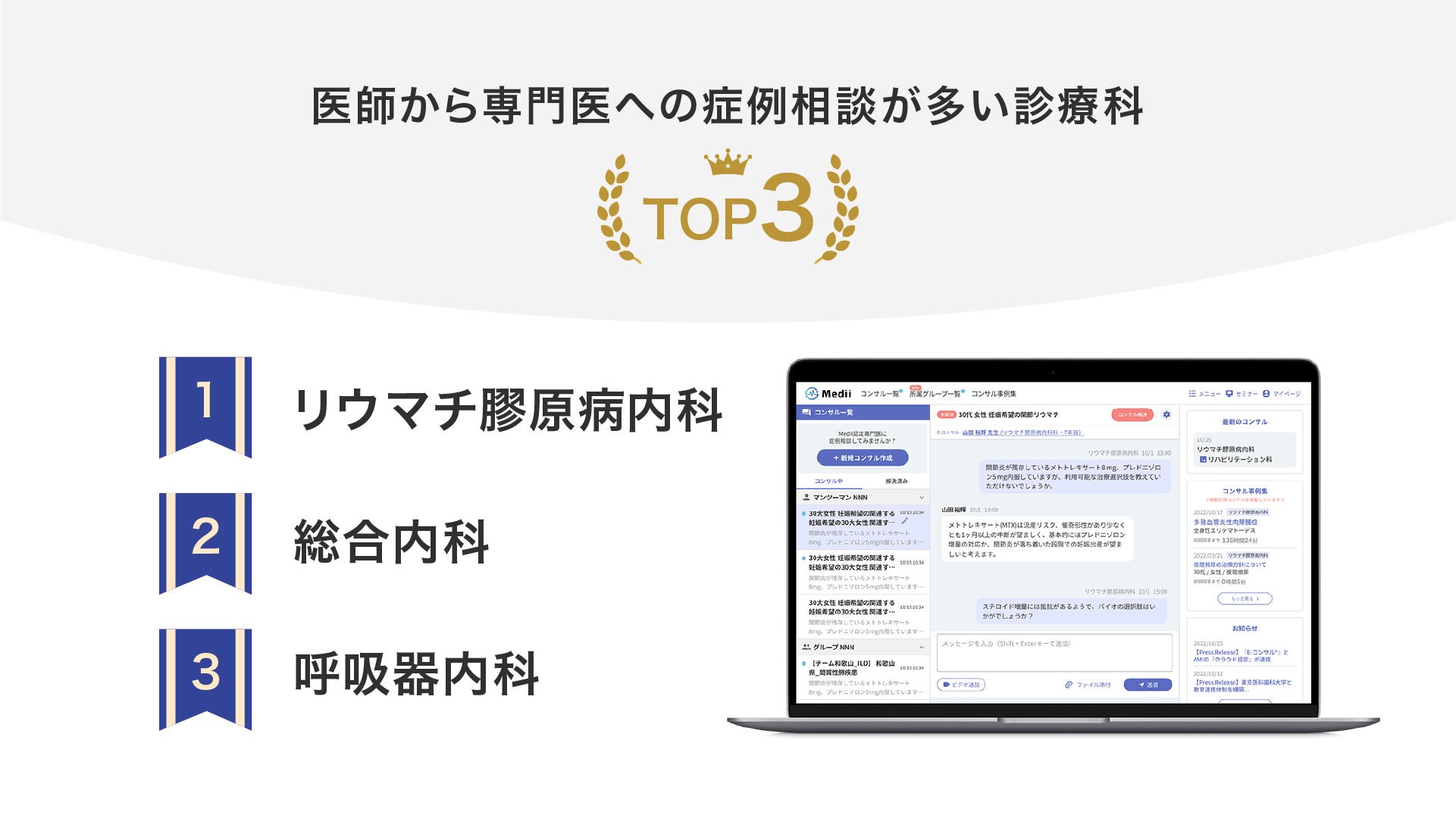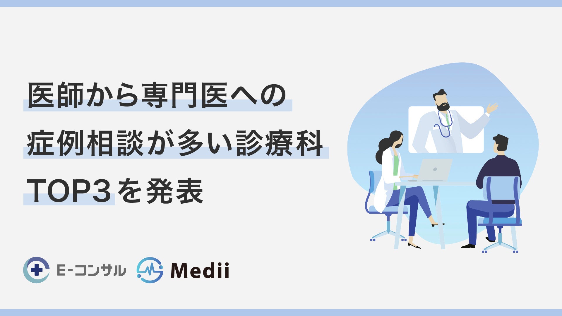 医師専用オンライン専門医相談サービス『E-コンサル®︎』を提供する株式会社Medii(東京都渋谷区、代表取締役医師:山田裕揮、以下Medii)は、E-コンサルに投稿された症例相談データより集計した、医師から専門医への症例相談が多い診療科ランキング上位3つを発表します。