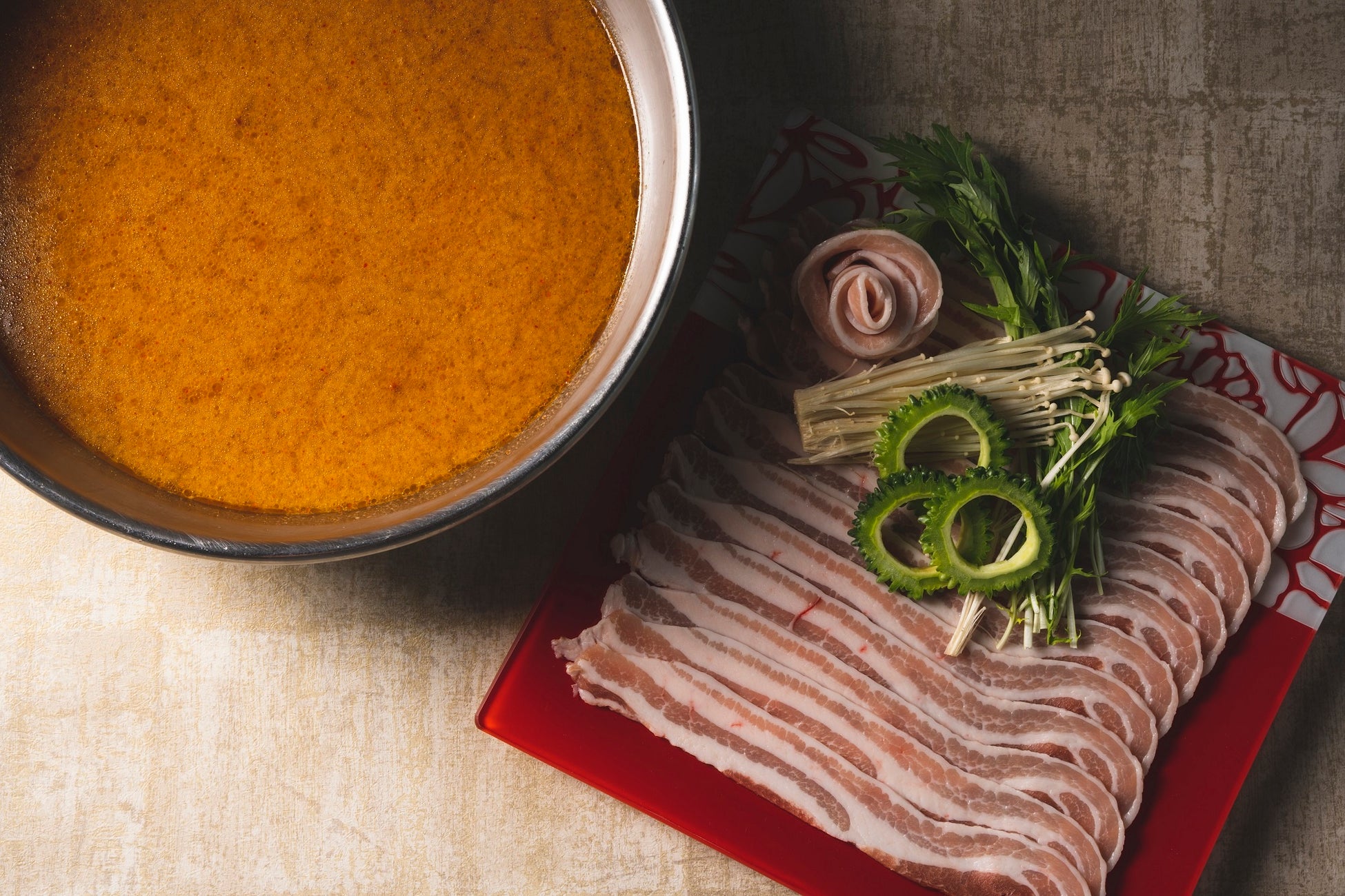 ビュッフェレストラン「スリユン」では、シグネチャーディッシュとして、炙ることで際立つ肉の香ばしさが食欲をそそる「炙り牛寿司」や、数種類のスパイスが効いた「県産豚の火鍋しゃぶしゃぶ」を常にご用意しております。