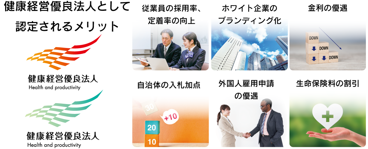 健康経営優良法人認定を取得し、健康経営を実施していることを「見える化」することで、従業員の採用率・定着率の向上や、ホワイト企業のブランディングを行うことが可能になります。