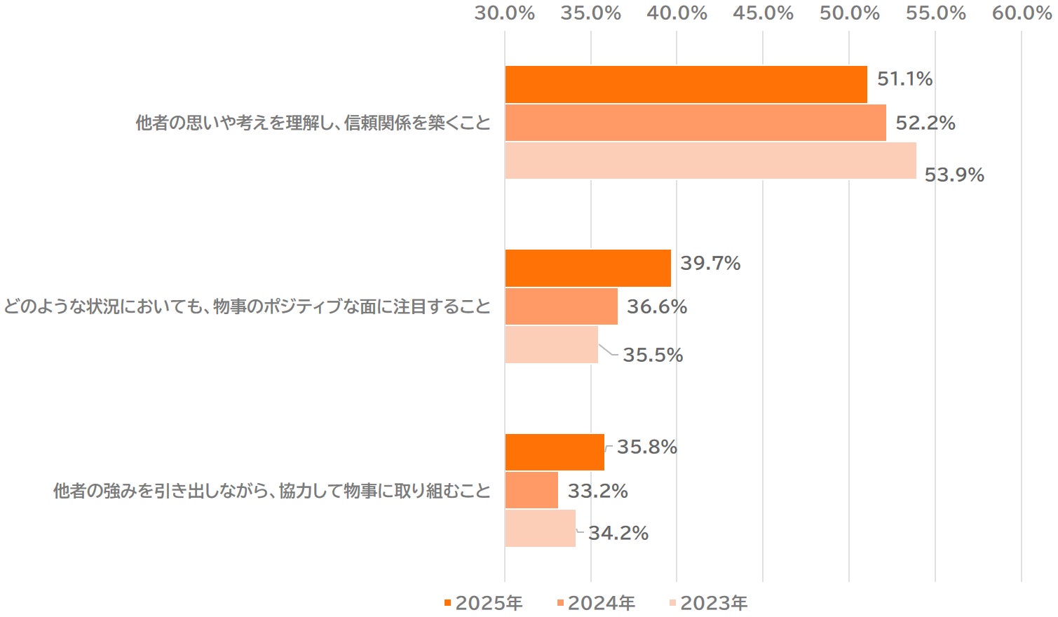 「自身の得意なこと・強み」として、「他者の思いや考えを理解し、信頼関係を築くこと」を選択した新入社員が51.1%で、3年連続で50%を超えました。