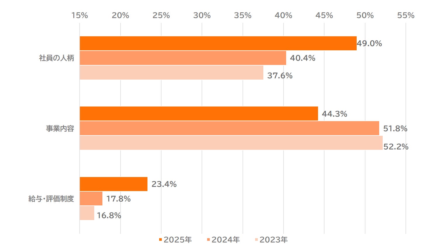 また、「入社する際に重視したポイント」として、「給与・評価制度」を選択した新入社員は2024年度から5%近く増加し、23.4%となりました。